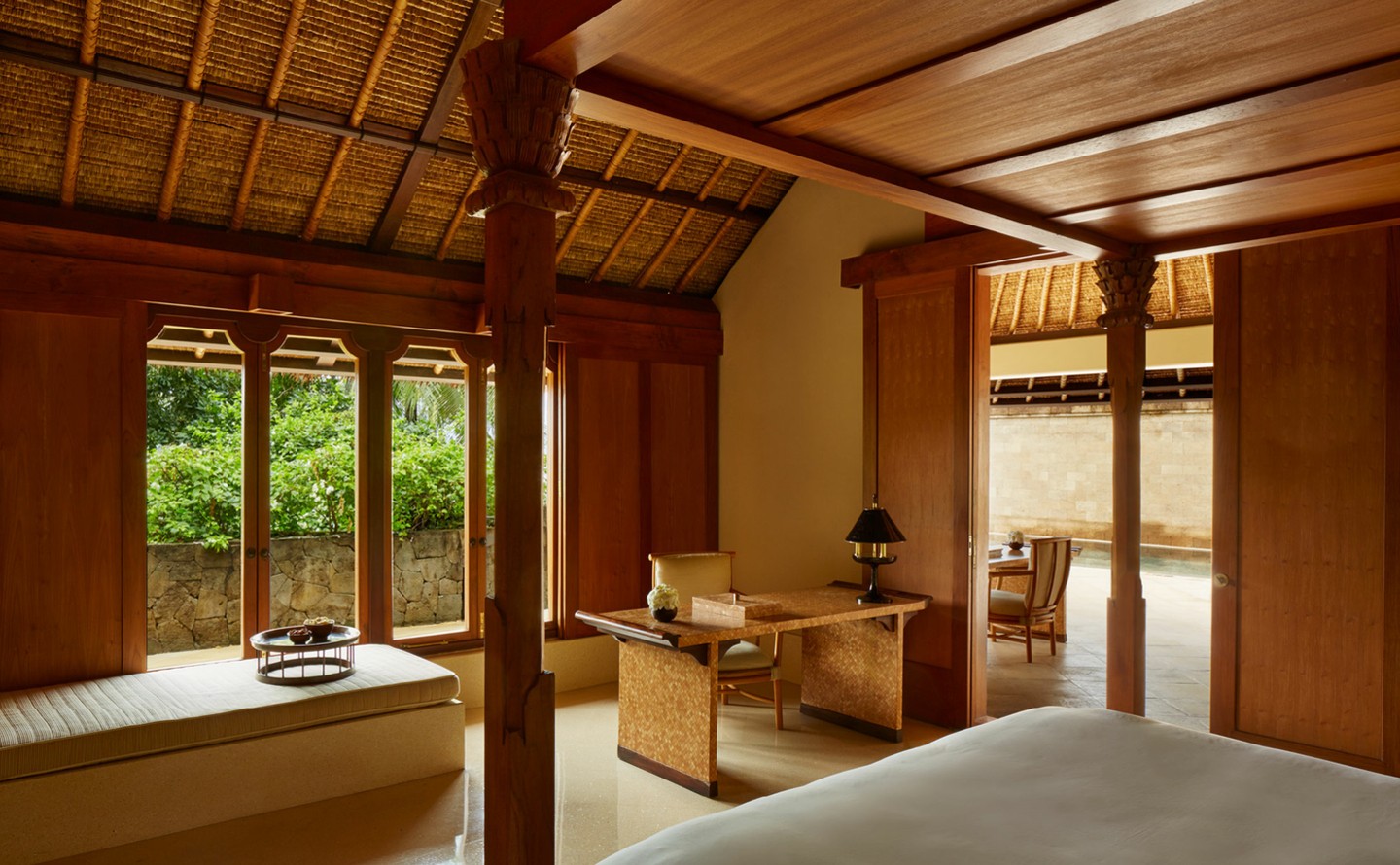 울창한 열대 정원 속에 자리한 204㎡ 규모의 가든 풀 파빌리온은 프라이빗 수영장과 녹음으로 둘러싸인 야외 테라스를 중심으로 한 한적한 휴식처를 제공합니다. 침실에는 캐노피 킹사이즈 침대가 있으며, 인접한 거실 공간은 하루 종일 조용한 휴식을 초대합니다. 넓은 욕실에는 깊은 침수식 욕조, 드레싱 에어리어, 더블 세면대가 있어 휴식과 재충전을 위한 고요한 성역을 제공합니다. 선별된 가든 풀 파빌리온은 풀 코트야드를 통해 신중하게 연결될 수 있어 가족이나 대규모 그룹이 함께함과 프라이버시를 동시에 즐길 수 있습니다.