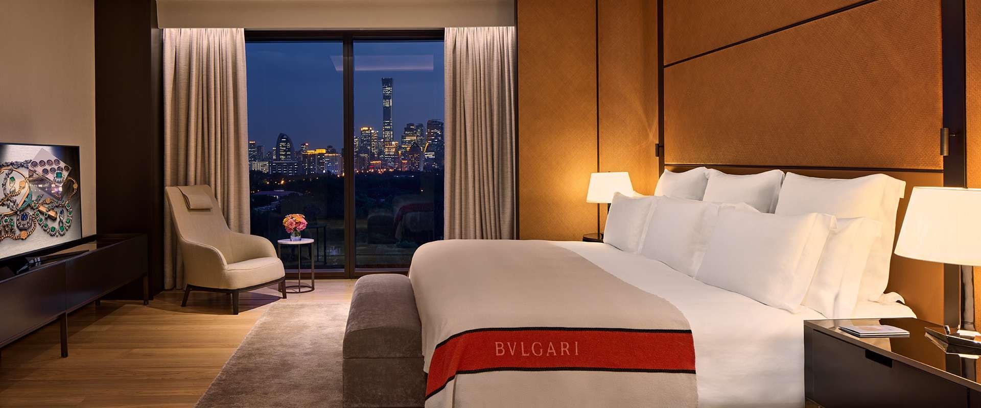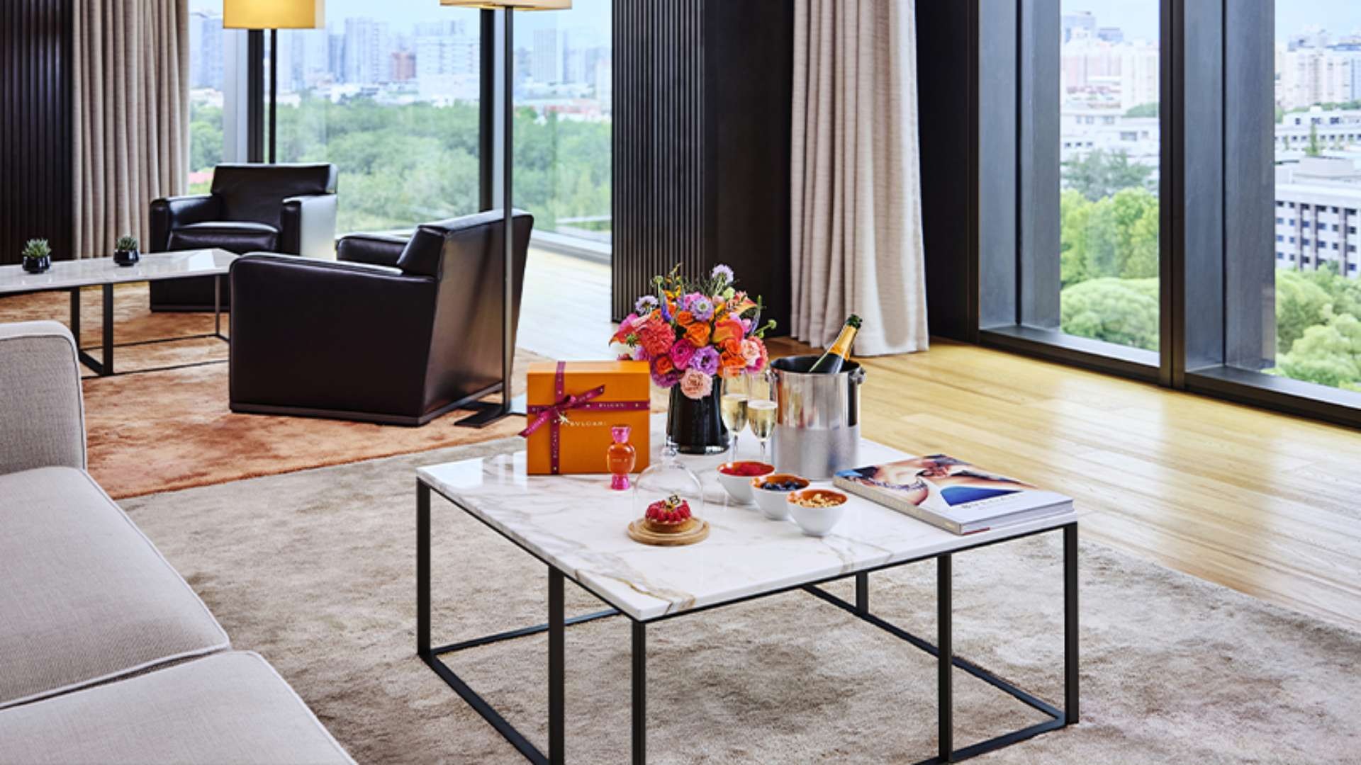 더 불가리 호텔 베이징의 프리미엄 스위트는 천장까지 닿는 대형 창문을 통해 량마 강과 베이징 스카이라인을 조망할 수 있는 럭셔리한 객실입니다. 편안한 슈퍼 킹 사이즈 침대에 고급 600 스레드 카운트 침구류와 이탈리아 맞춤 디자인 가구가 갖춰져 있습니다. 넓은 워크인 알코브를 통해 진주빛 화이트 나보나 트래버틴으로 마감된 마스터 욕실로 연결되며, 대형 샤워실과 인상적인 검은색 화강암 욕조가 설치되어 있습니다. 170/214㎡.