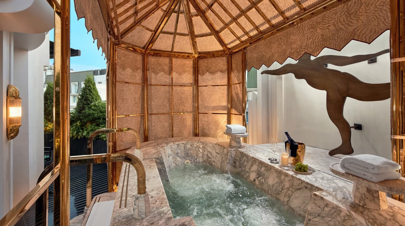 가장 웅장한 스위트는 나비 부인을 위해 마련되었습니다. 동서양 간의 비극적인 사랑 이야기인 나비 부인의 문화 융합은 프랑스 아르데코 인테리어 위에 베트남식 악센트를 더해 표현됩니다. 초초산이 미국 해군 장교 핑커튼과 그녀의 아들을 향한 넘치는 사랑을 느껴보세요. 최대 10명의 손님을 수용할 수 있는 개방형 거실과 식당을 갖춘 넓은 스위트에서 말입니다. 엔터테인먼트에 완벽한 이 스위트는 잘 갖춰진 주방과 호화로운 야외 바를 갖추고 있으며, 하노이 럭셔리 호텔의 편의시설을 원하는 손님들에게 이상적입니다. 환상적인 대리석 욕실이 있는 프라이빗 야외 테라스로 나가 호안끼엠 지구 최상층에서 여유로운 목욕을 즐기며 고급스러운 생활을 경험하세요.