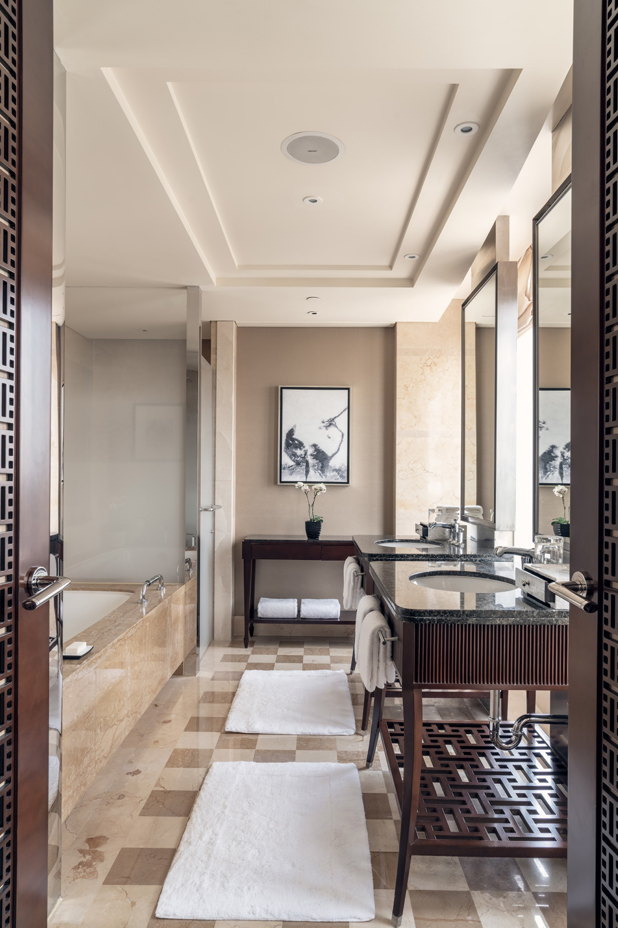 6인 식탁이 있는 레지던시 스타일의 스위트로, 최상층에서 시티 뷰를 감상할 수 있으며, 풍부한 우드 톤과 골드 장식으로 세련되고 따뜻한 분위기를 연출합니다. 가족 식사를 위한 완벽한 공간입니다.