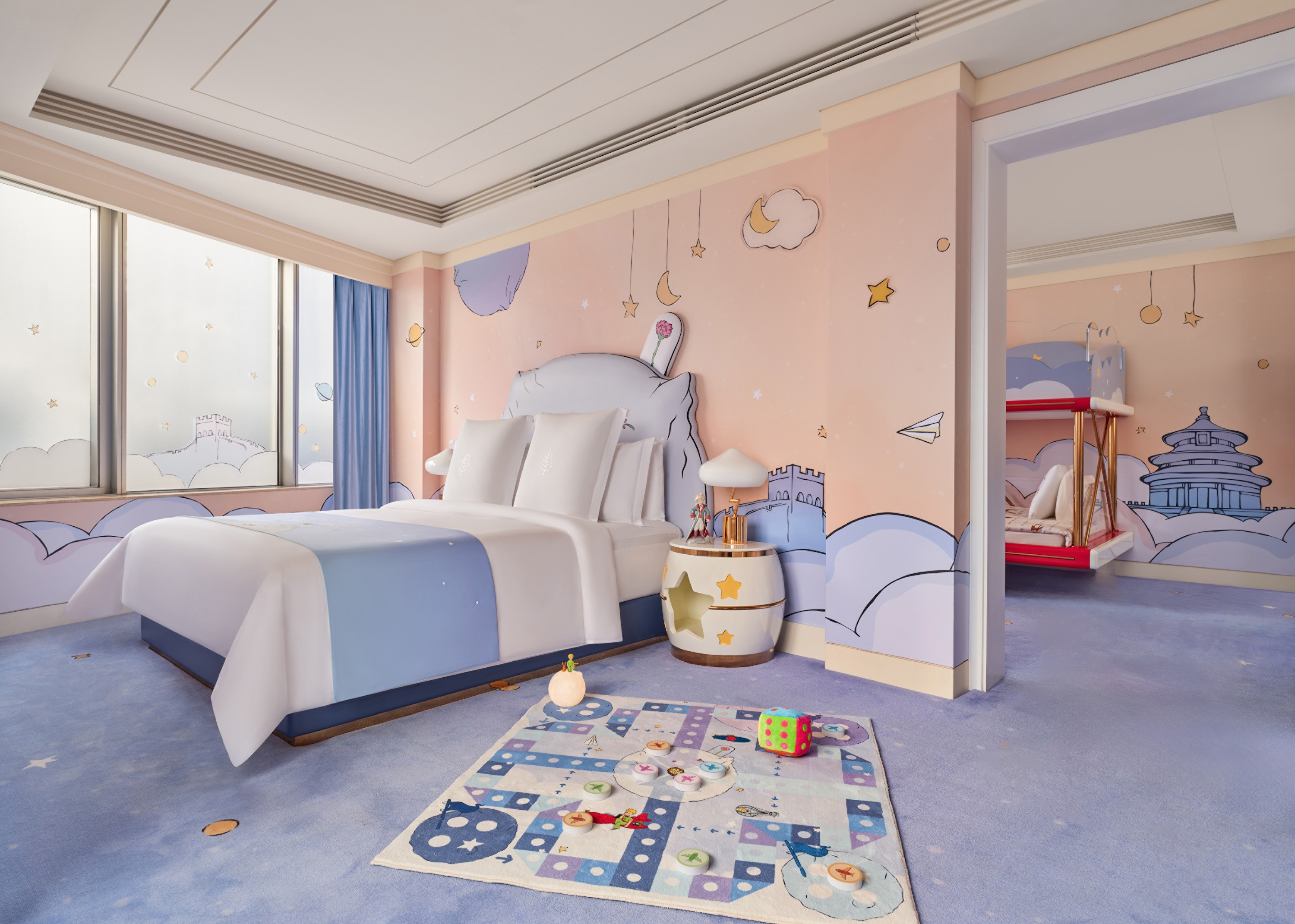 장미, 행성, 여우가 부드러운 파란색 카펫과 구름 무늬 벽지와 함께 시간과 공간을 넘나드는 성간 여행을 선사합니다. 별이 빛나는 램프의 은은한 빛이 슬라이드가 있는 빨간 비행기 침대를 밝게 비추며, 마치 은하계를 횡단하는 듯한 경험을 제공합니다. 구름 속에 숨겨진 만리장성과 천단은 리틀 프린스와 베이징의 문화유산이 완벽하게 조화를 이루도록 합니다.