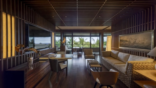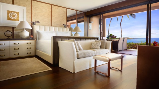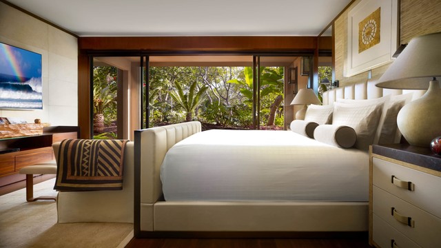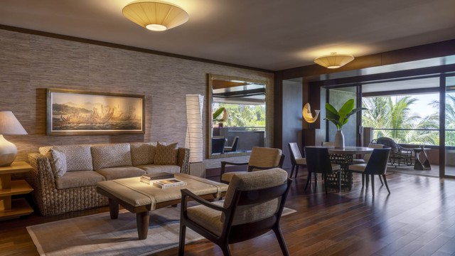 중립적인 색조와 풍부한 색감의 원목 바닥으로 꾸며진 개방형 디자인은, 바닥부터 천장까지 이어지는 슬라이딩 유리문 밖으로 보이는 정원의 녹음을 열대의 활기로 가득 채웁니다. 로맨틱한 휴가나 가족과 함께하는 하와이 여행에 이상적인 이 고요한 1층 스위트룸에는 킹사이즈 침대 1개와 소파베드 1개, 그리고 욕실 2개가 갖춰져 있습니다. 1,280평방피트.