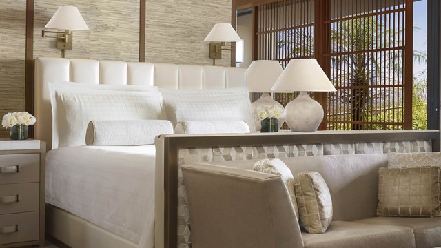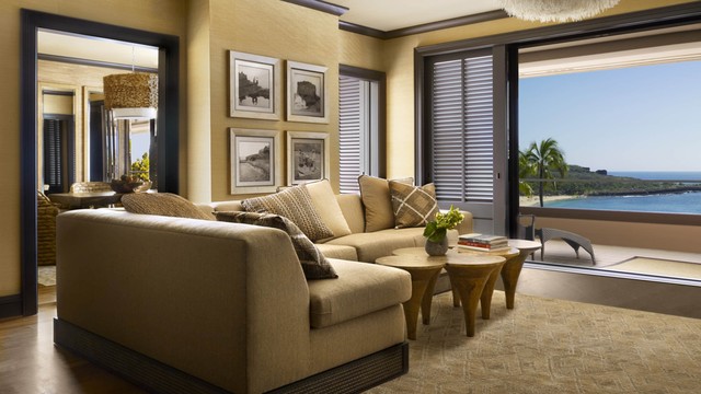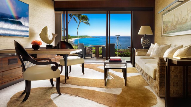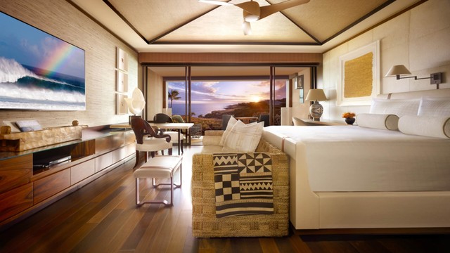 맞춤 제작 가구와 우아한 예술 작품으로 가득 찬 이 호화로운 투베드룸 스위트는 새롭게 단장된 미드센추리 스타일의 오픈 컨셉 거실 및 다이닝 공간, 격식 있는 응접실, 미디어룸, 서재, 세 개의 야외 라나이, 그리고 넓은 침실을 갖추고 있어 고급스러운 아일랜드풍 주택의 분위기를 자아냅니다. 투베드룸 스위트. 킹사이즈 침대 2개와 소파베드 2개. 욕실 3개. 3,984제곱피트(약 370제곱미터).