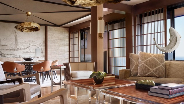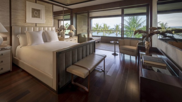 탁 트인 바다 전망과 자연광이 천장부터 바닥까지 이어지는 통유리를 통해 넓은 스튜디오 스위트룸의 거실과 네팔산 록타 벽지로 장식된 칸막이로 분리된 침실 공간으로 쏟아져 들어옵니다. 킹사이즈 침대 1개, 욕실 1개, 86m² (925ft²).