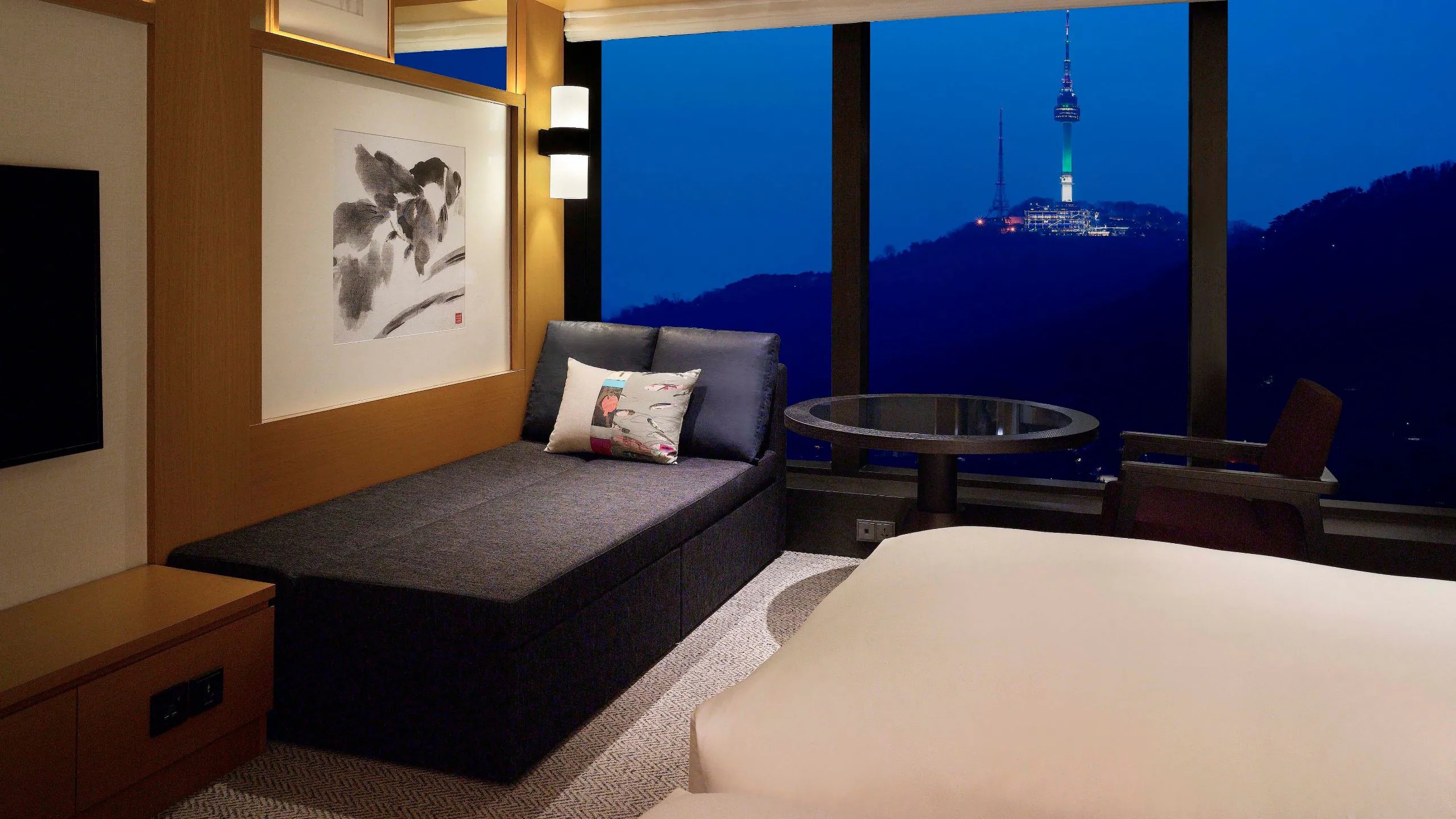 남산과 도시의 파노라마 전망을 자랑하는 모던한 객실입니다. 트윈베드 2개와 소파베드가 마련되어 있으며 고층에 위치해 있습니다.
