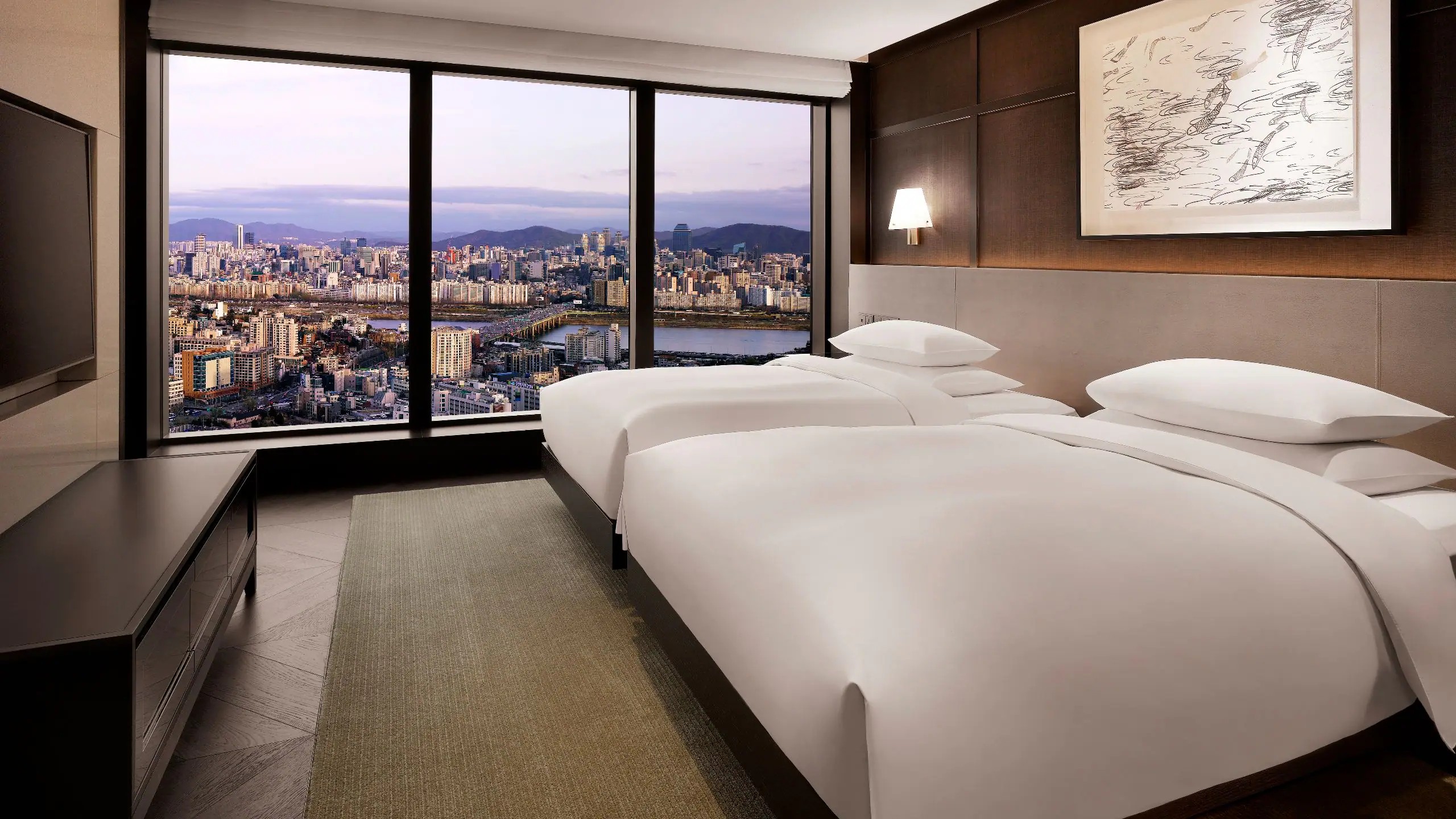 한강의 멋진 전망이 넓은 럭셔리 스위트로 여러분을 맞이하며, 별도의 거실과 침실을 갖추고 있습니다. 푹신한 트윈 베드와 깊은 욕조가 있는 대리석 욕실을 즐겨보세요. 이 객실은 프리미엄 스위트입니다. 만 13세 미만 어린이는 이브닝 칵테일 시간 동안 그랜드 클럽 라운지 입장이 제한될 수 있습니다.
