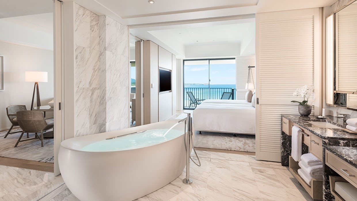 비치 프런트 윙에 위치한 이그제큐티브 오션 스위트는 우아함과 세련미의 정점을 보여줍니다. 76㎡의 넉넉한 크기를 자랑하며, 침실과 욕실 모두에서 반짝이는 바다 전망을 감상하실 수 있습니다. 투숙 인원: 1~2명