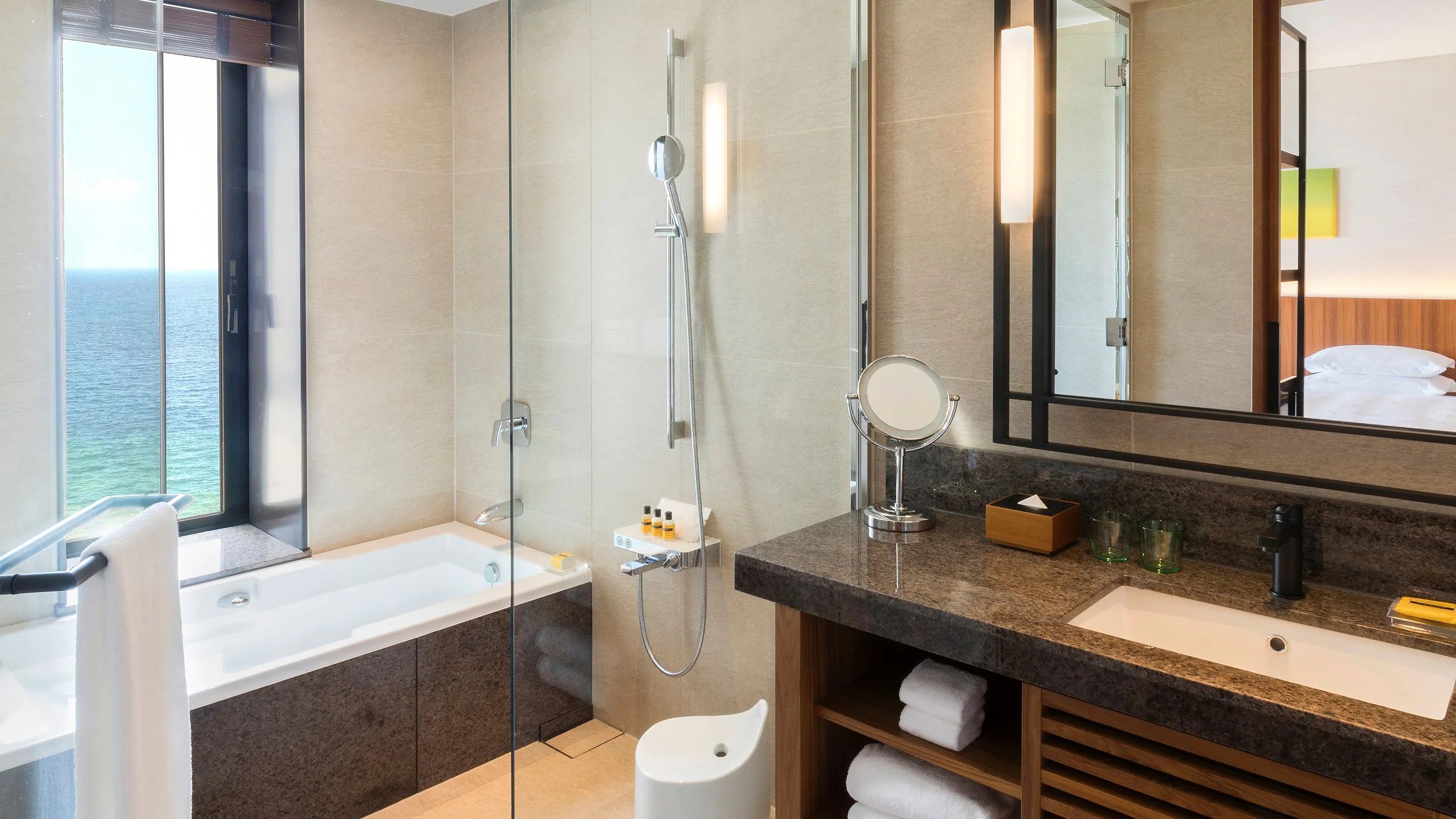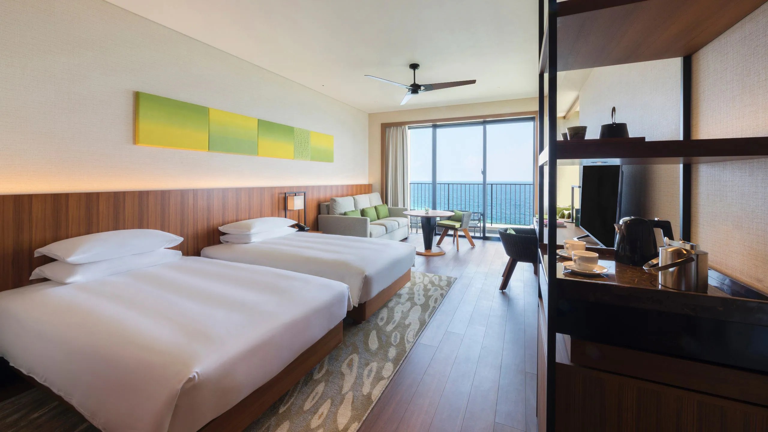 51㎡ 규모의 이 객실은 세라가키 어항, 나고만의 해안선, 그리고 온나산의 아름다운 능선을 바라보는 발코니를 갖추고 있습니다. 어스톤으로 세련되게 장식된 객실에는 오키나와의 바람을 즐길 수 있는 천장 선풍기와 넓은 업무 공간이 마련되어 있습니다. 이 객실은 트윈베드 2개와 소파베드에서 최대 6명(성인 4명 제한)까지 수용할 수 있습니다.
