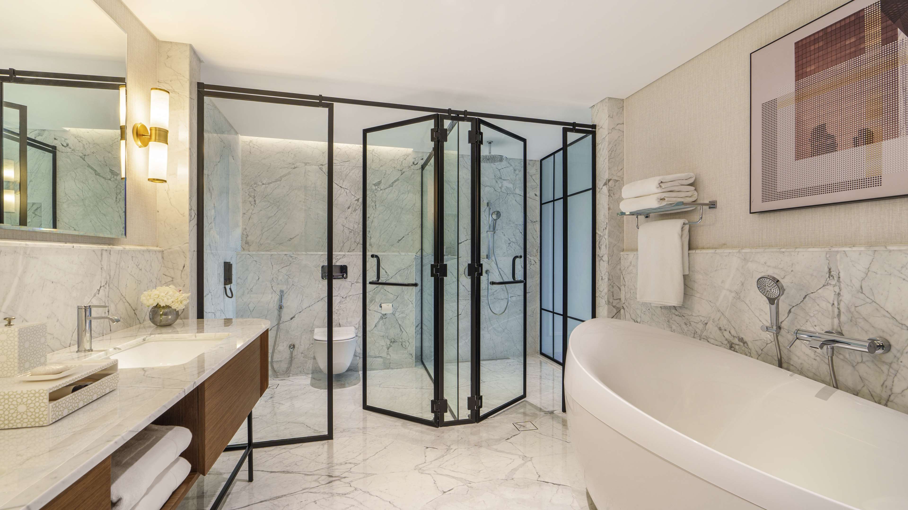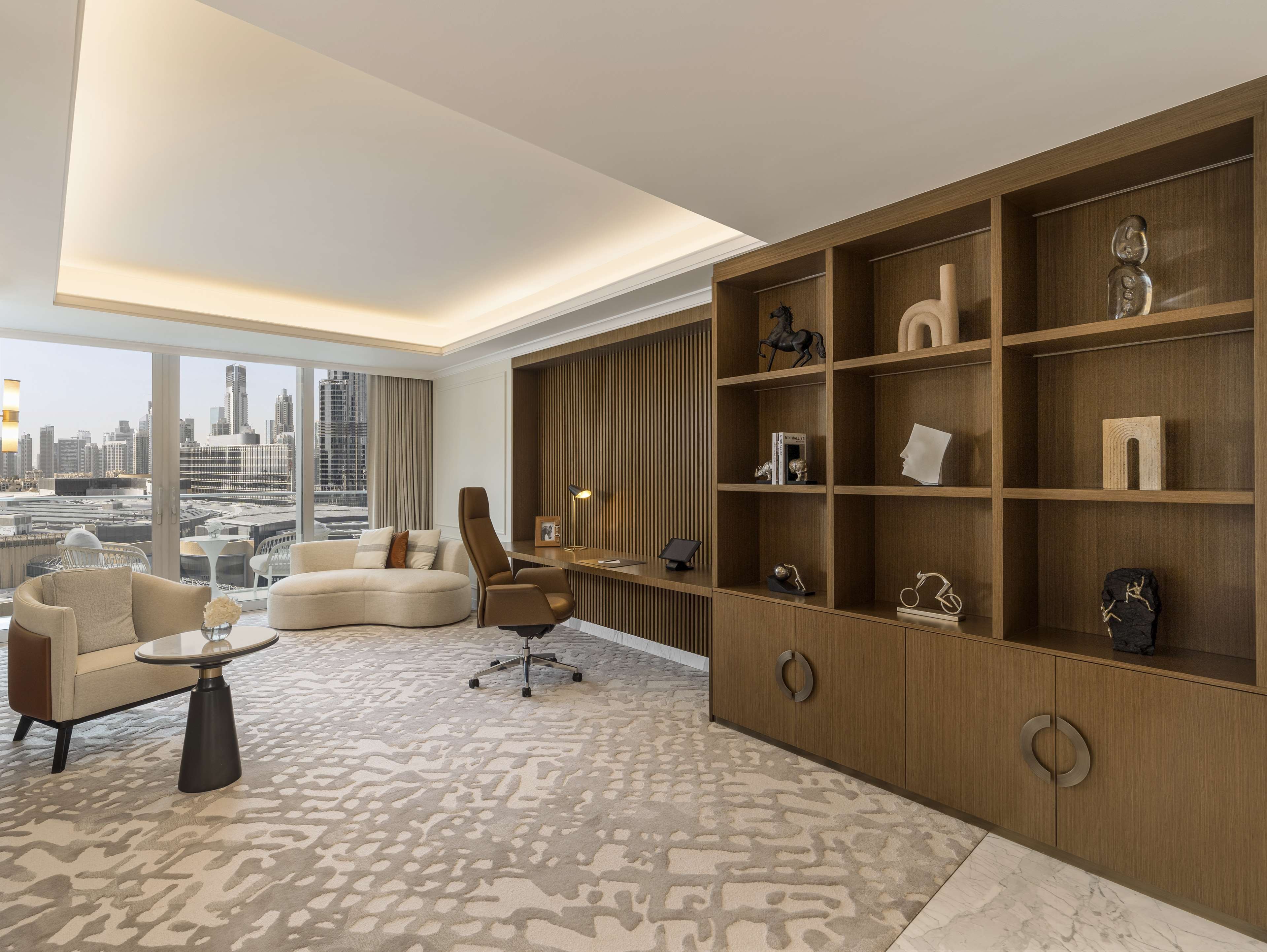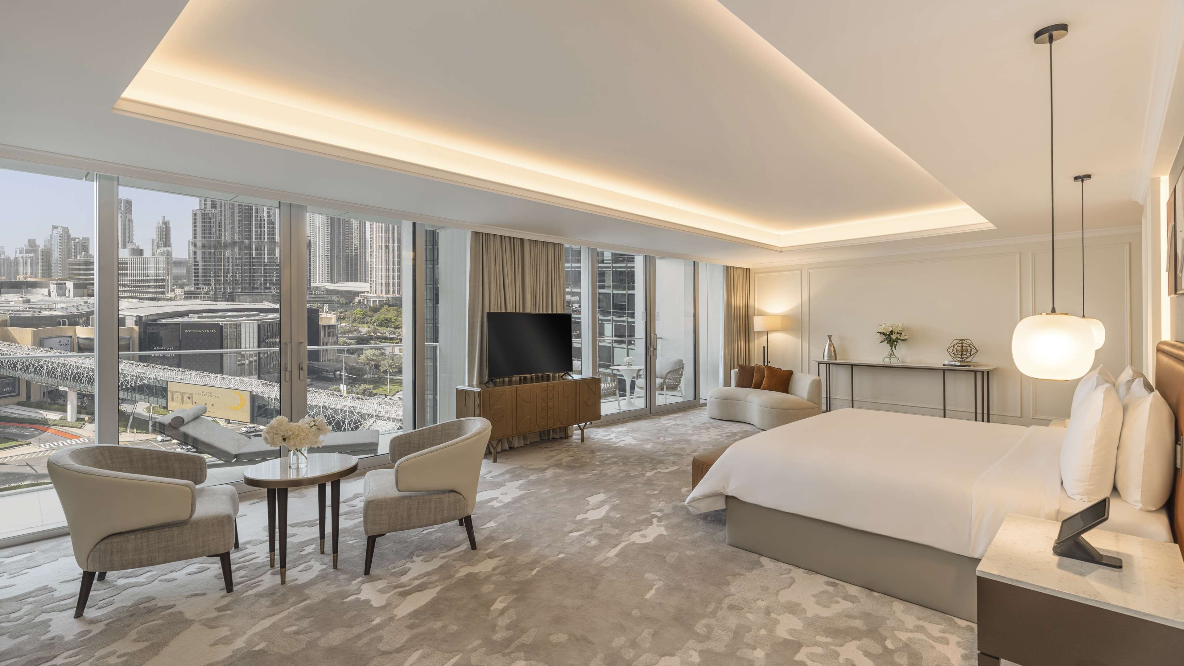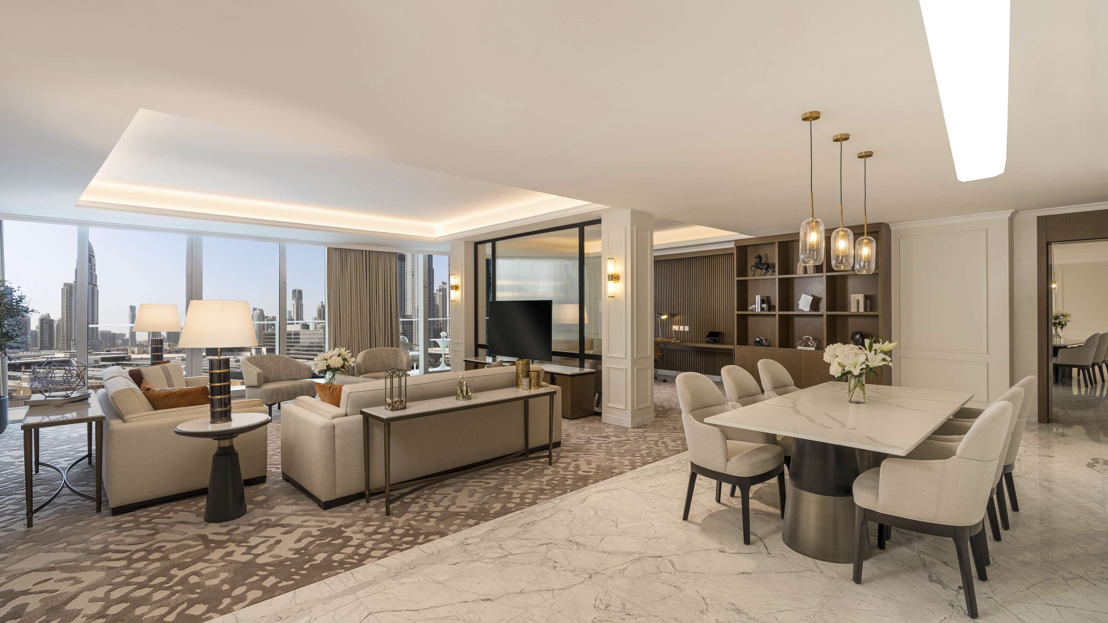 202㎡ 규모의 스위트에서 럭셔리한 휴식을 만끽해 보세요. 발코니에서는 숨 막히는 파노라마 전망이 펼쳐집니다. 이 아름다운 스위트는 킹사이즈 침대가 비치된 호화로운 침실, 최첨단 기술이 적용된 거실 공간, 그리고 넓은 욕실로 구성되어 있습니다. 커피 머신, 프리미엄 욕실 용품, 클럽 라운지 전용 이용 혜택과 같은 세심한 배려가 더해져 럭셔리한 경험을 완성합니다. 두바이 최고의 명소 중 한 곳에서 무료 체험을 즐겨보세요. 두바이 돌고래 수족관, 글로벌 빌리지, 마담 투소 또는 Rayna Tours와 제휴하여 제공되는 시티 투어 중 선택하실 수 있습니다.
