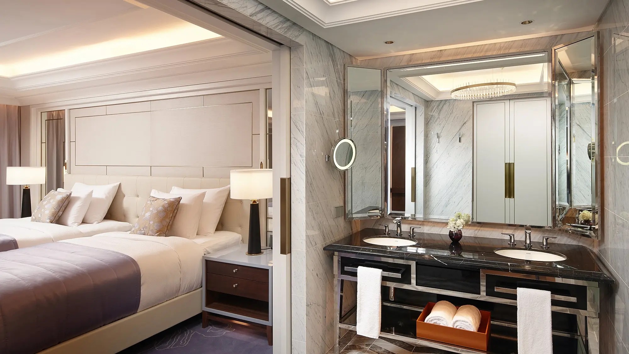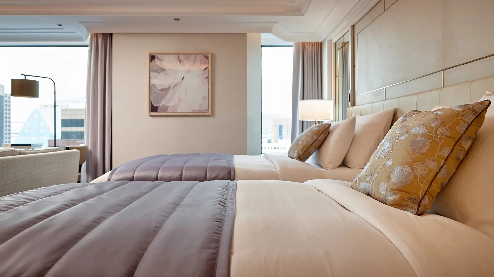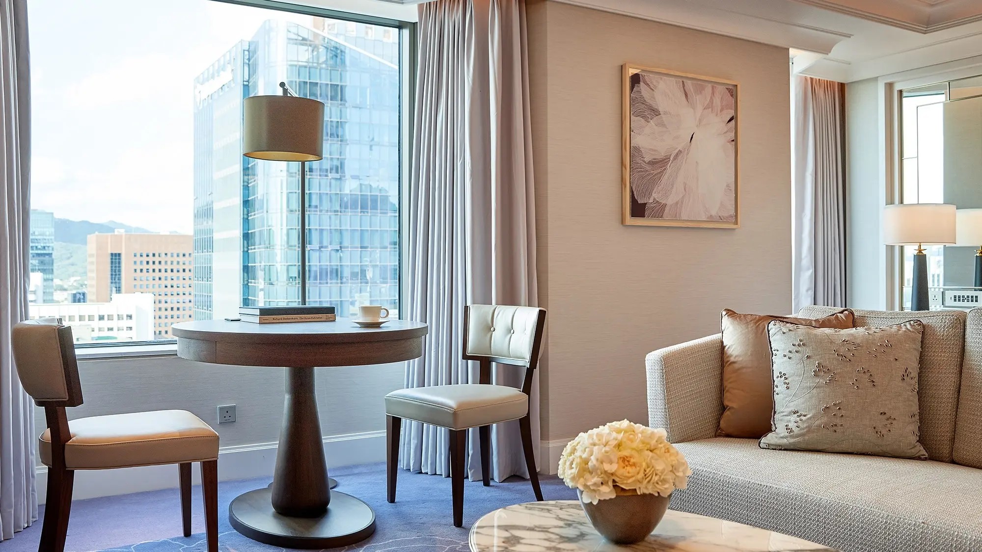 넓고 밝은 프리미어룸은 절제된 화려함과 편안함을 갖춘 최고급 객실입니다. 보라색, 금색, 대리석의 아름다운 조화 속에서 서울 도심의 활력을 느껴보세요.