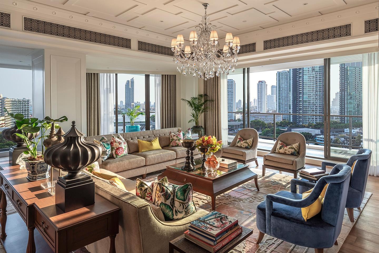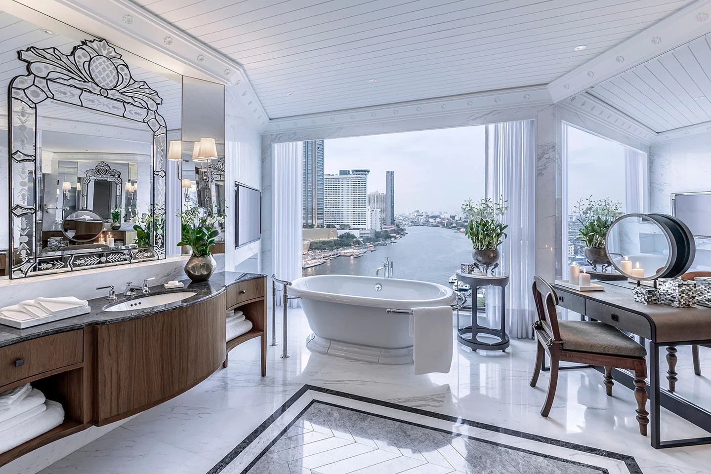 많은 귀빈을 맞이했던 이 멋진 2 베드룸 펜트하우스는 57.6㎡ 규모의 랩어라운드 테라스에서 환상적인 리버 뷰를 제공합니다. 태국산 실크, 티크 바닥, 페르시아 카펫으로 장식된 이 스위트는 여러 개의 좌석 공간이 있는 넓은 거실, 12인용 다이닝룸, 주방을 갖추고 있어 손님 접대에 이상적입니다. 마스터 베드룸은 앤티크 가구와 독특한 파인애플 캐노피 침대로 꾸며져 있습니다. 376㎡ 규모의 이 스위트는 전용 엔터테인먼트룸도 갖추고 있습니다.