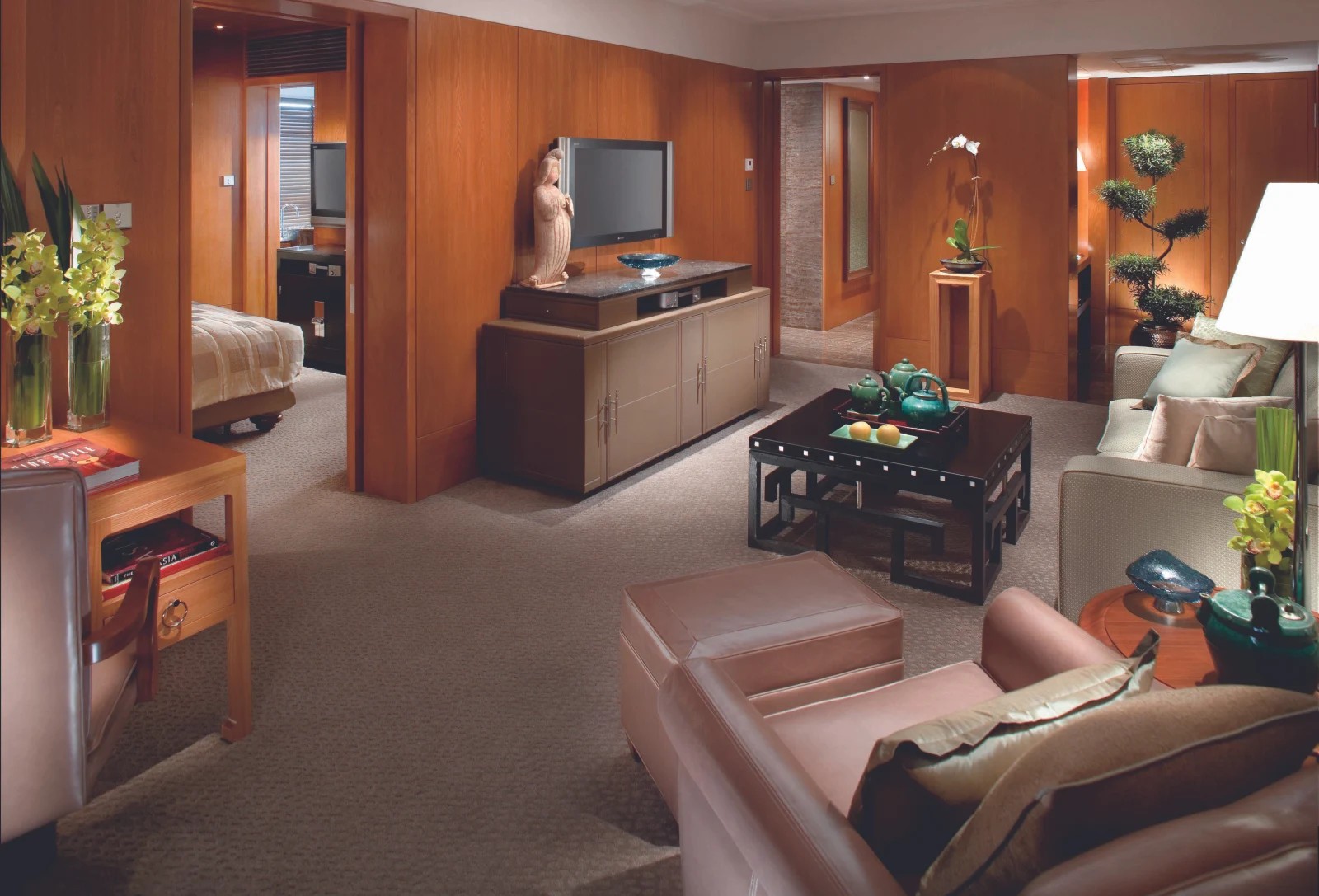 호텔의 코너에 위치한 프라임 포지션을 차지하고 있는 이 광활한 스위트는 2개 벽면의 천장부터 바닥까지 이어진 유리창, 중국 느릅나무와 짐 톰슨 실크 벽 패널, 세련된 디자이너 조명, 빈티지 중국 미술 작품, 그리고 슈퍼 킹사이즈 침대를 갖추고 있습니다. 객실에는 대형 드레스룸과 3개의 평면 TV를 포함한 첨단 어메니티가 마련되어 있습니다.