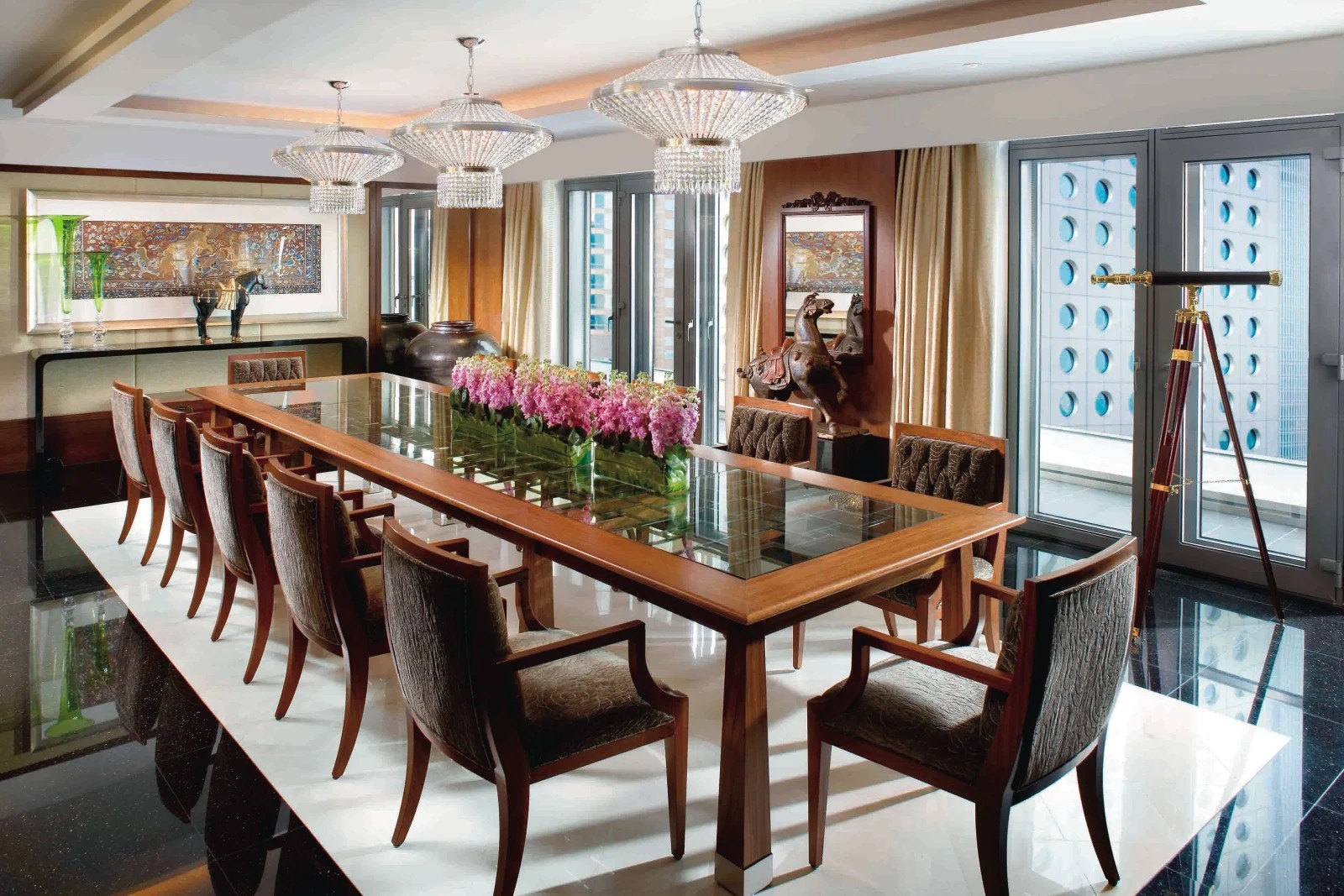 거실의 이중 높이 천장과 대면적 유리창을 통해 주변 스카이라인과 빅토리아 항구의 매혹적인 전망을 감상할 수 있습니다. 거실과 식당 공간 전체를 따라 발코니가 이어져 있습니다. 귀중한 골동품, 복원된 가구, 수공예 작품으로 우아하게 꾸며져 있으며, 인접한 침실 1개 스위트에는 거실, 침실, 욕실이 구성되어 있습니다.