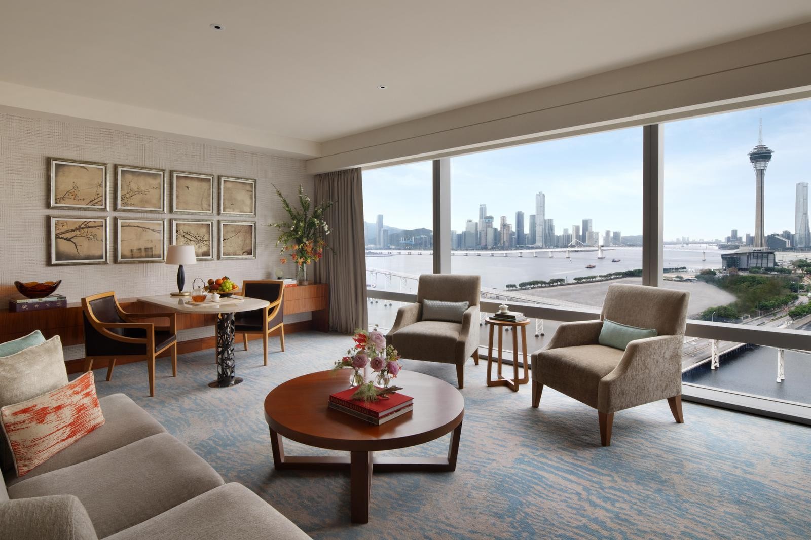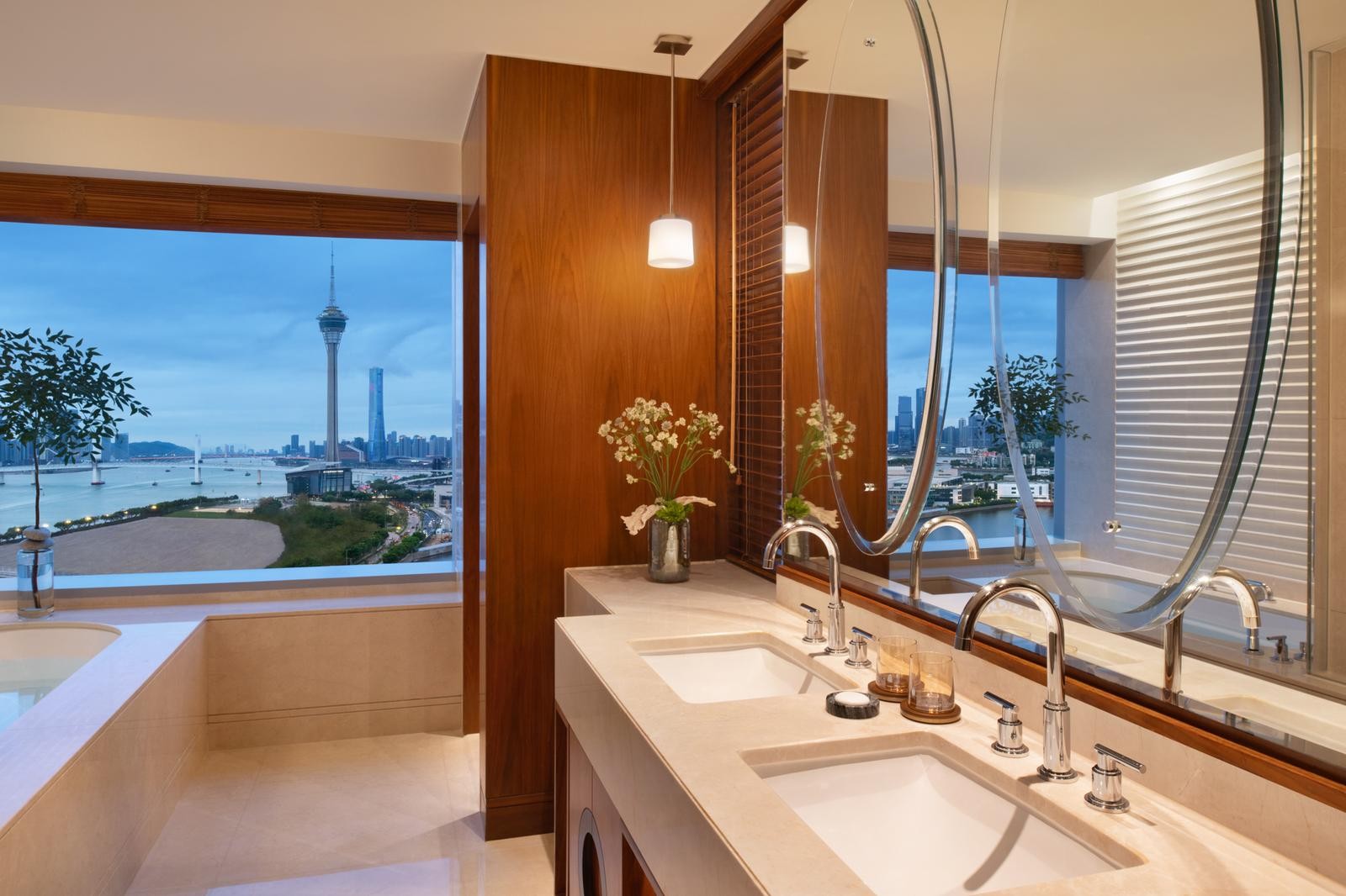 이 넓게 설계된 스위트에서는 마카오 전역과 남완 호수를 거쳐 마카오 타워까지 펼쳐진 전망을 감상할 수 있습니다. 부드러운 중성 색상 팔레트를 사용하여 스위트는 고급스러운 카펫, 부드러운 조명, 정교한 가구로 럭셔리한 분위기를 자아냅니다. 새틴 린넨으로 장식된 킹베드가 넓은 침실의 중심에 자리하고 있으며, 인접한 거실에는 아름답게 장식된 다양한 좌석이 마련되어 있습니다.