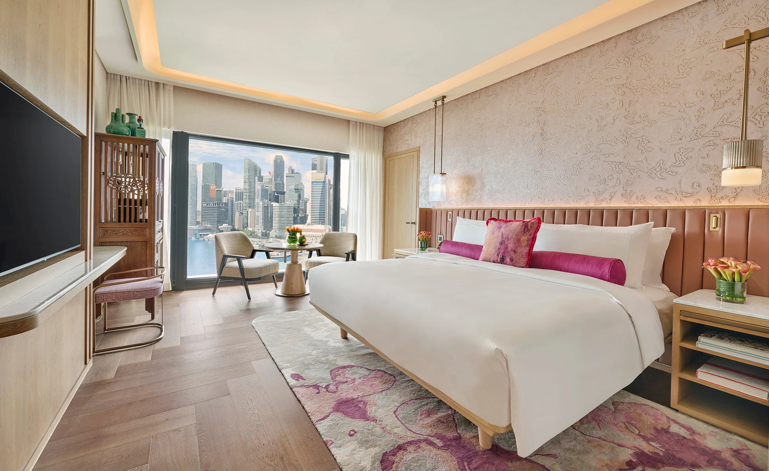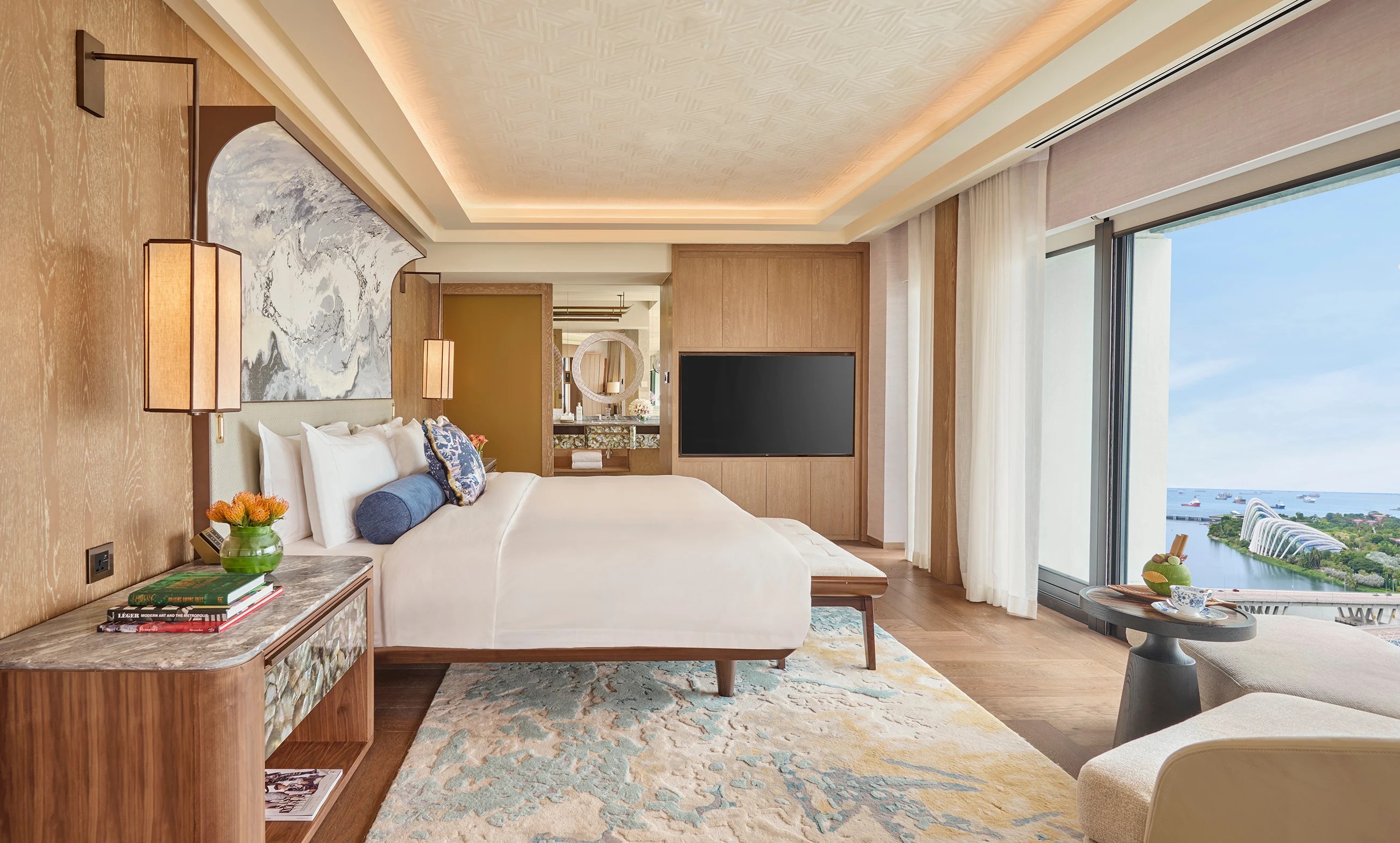마리나 베이의 멋진 전망을 감상할 수 있는 넓은 거실 공간, 슈퍼 킹 사이즈 베드를 갖춘 침실, 대형 다이닝룸으로 구성된 이 호화로운 프레지덴셜 스위트에서 세련된 럭셔리를 경험해 보세요.