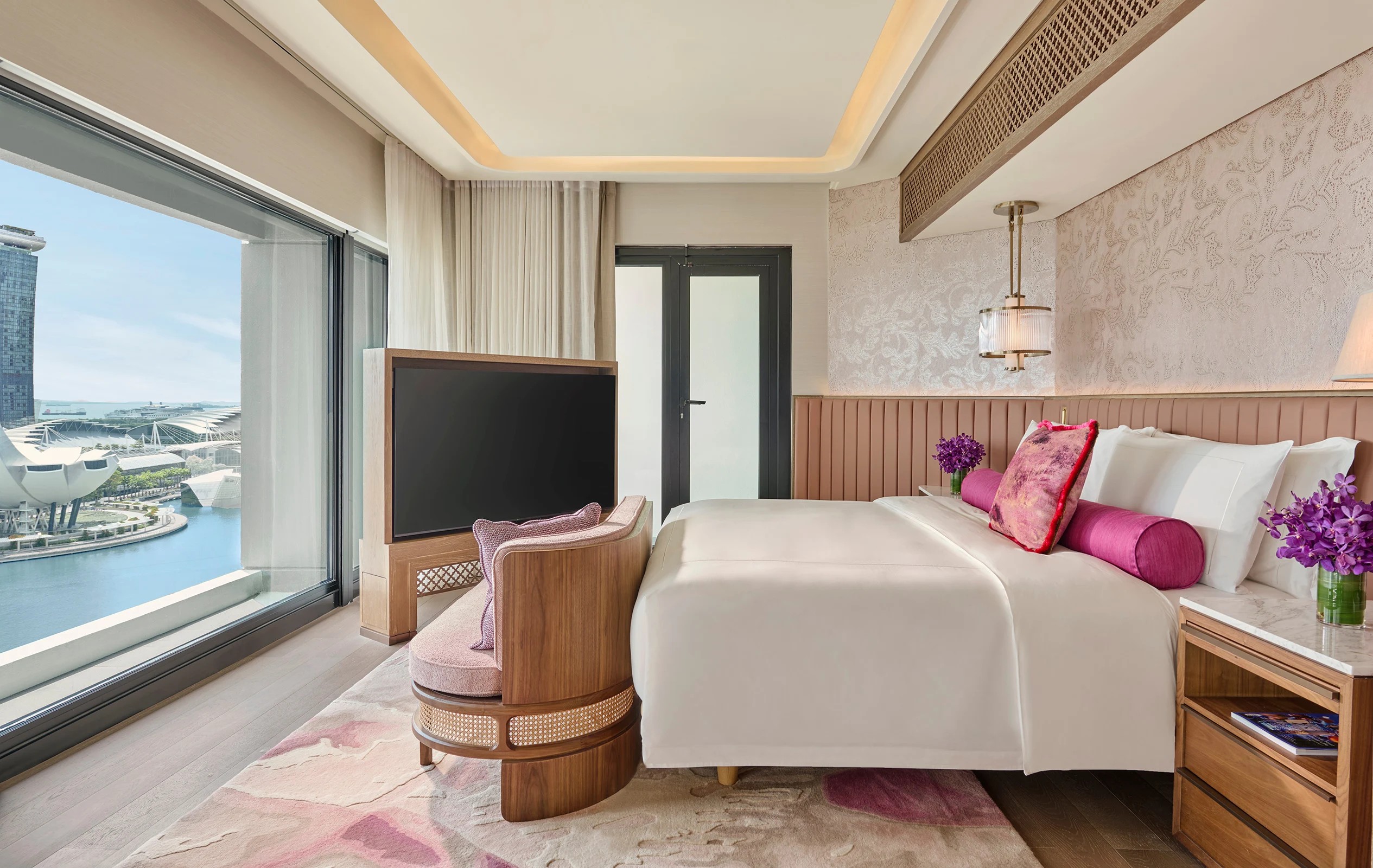 바다의 파노라마 전망을 자랑하는 이 스위트는 우아하게 꾸며져 있으며, 현지 디자인 감각이 가미된 생생한 마젠타 색상의 벽 인테리어가 특징입니다. 전용 라운지 이용 혜택도 함께 제공됩니다.