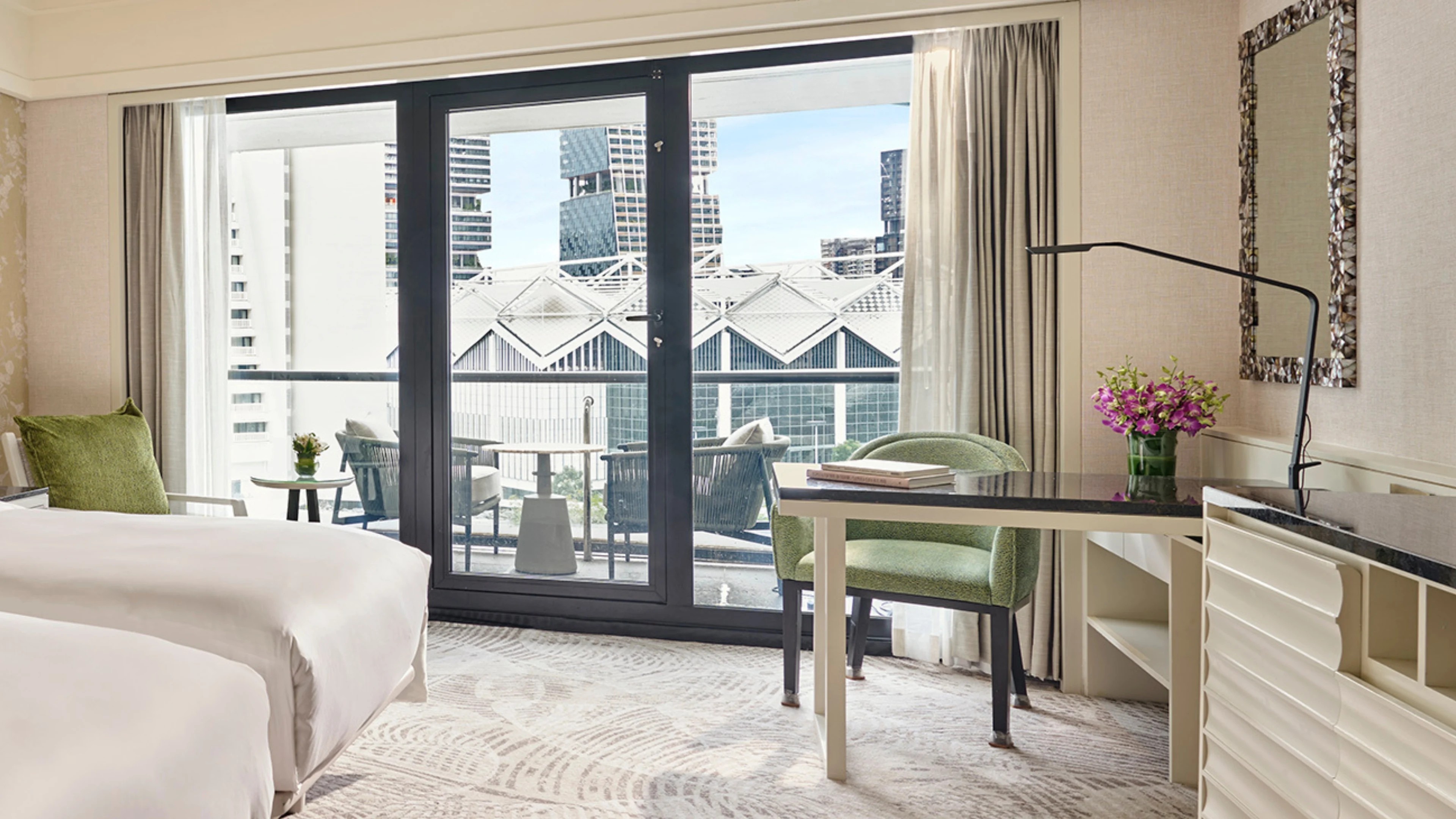 바닥부터 천장까지 이어지는 통유리창으로 도시 전망을 감상할 수 있는 이 넓은 객실은 전용 발코니와 우아한 욕실을 완비하고 있습니다. 욕실에는 레인 샤워기와 고급 욕조가 마련되어 있습니다.