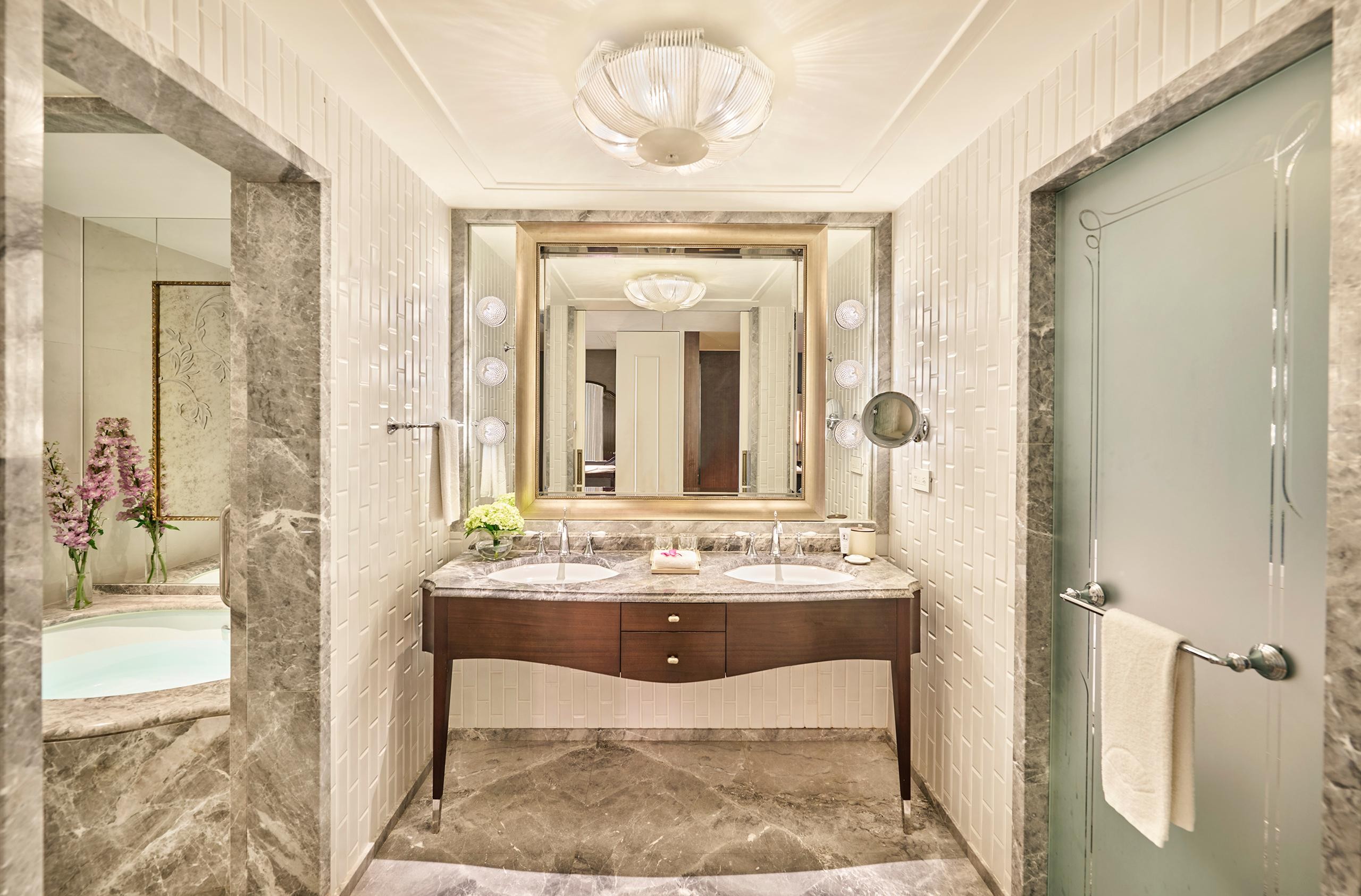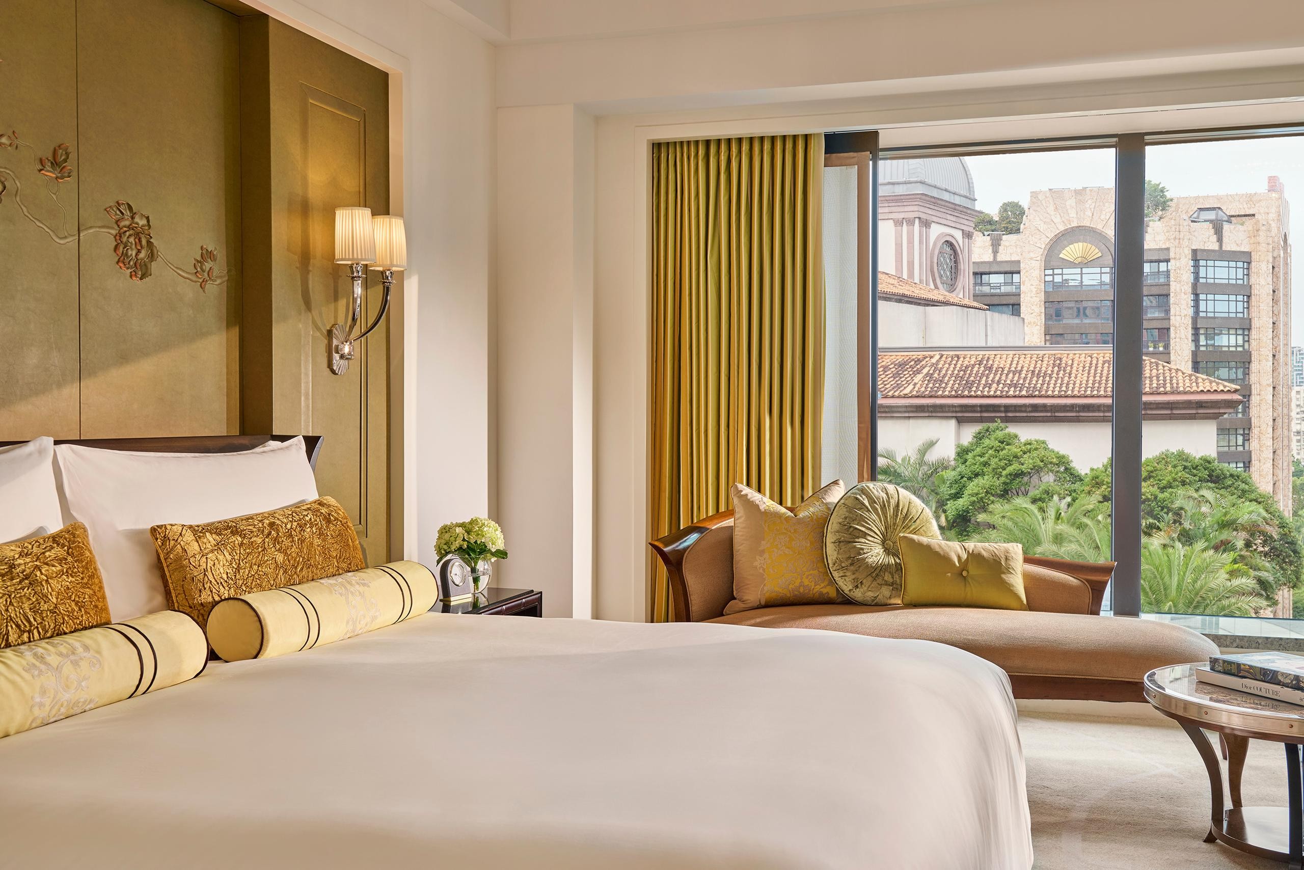 도시 또는 아름답게 조경된 호텔의 정원과 수영장이 내려다보이는 전망을 감상하며 편안한 분위기를 즐겨보세요. 이 우아한 객실은 아름다운 다크 우드 가구와 분위기 있는 조명으로 세련된 느낌을 선사합니다.