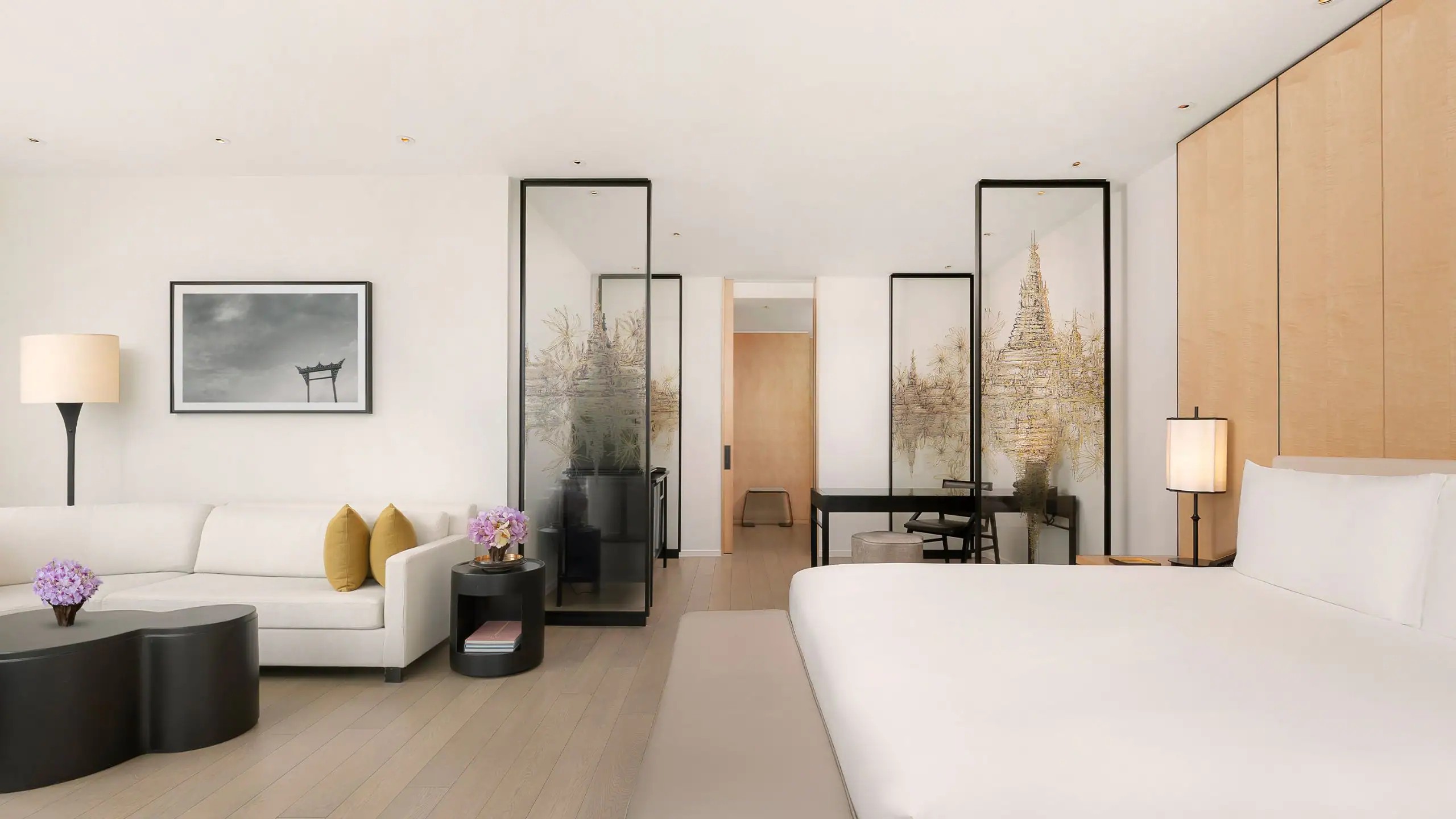68–85㎡ 넓이의 고요한 코너룸에서 킹 베드 1개, 180도로 펼쳐지는 시티 뷰, 넓은 거실 공간과 서재 공간을 즐기며 휴식을 취해보세요.