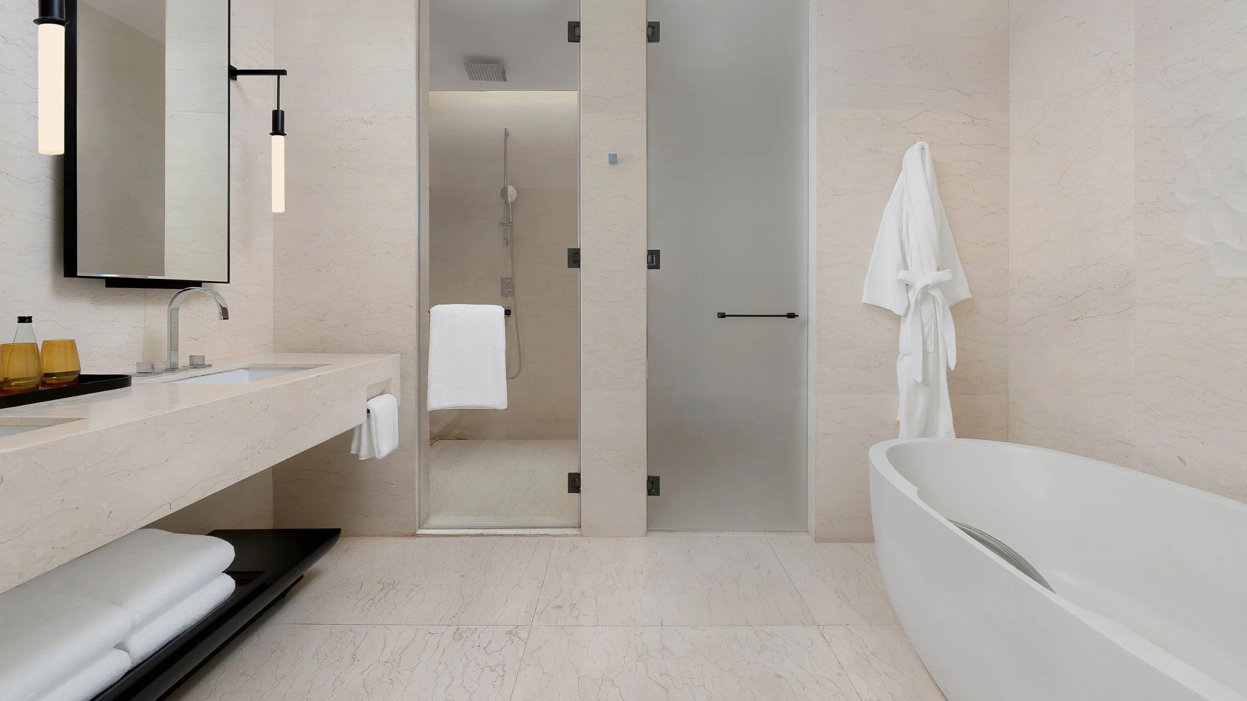 49~61㎡ 규모의 객실에서 편안한 휴식을 즐겨보세요. 2개의 트윈 베드와 바닥부터 천장까지 이어지는 통유리창 너머로 인상적인 시티 뷰가 펼쳐집니다.