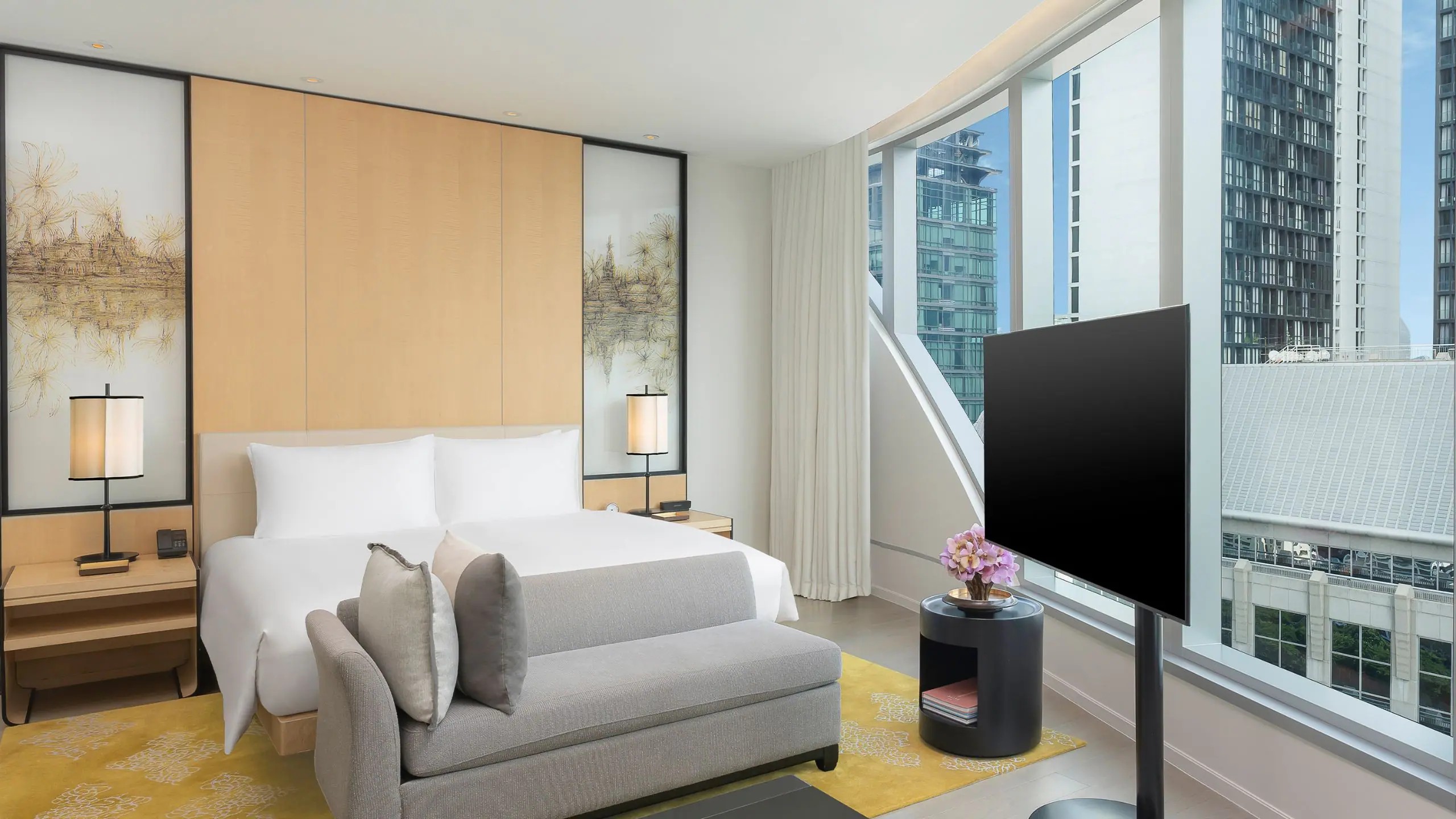 48–50㎡(제곱미터) 크기의 편안한 객실에서 휴식을 취해 보세요. 킹 베드 1개가 마련되어 있으며, 바닥부터 천장까지 이어지는 통유리창을 통해 도시와 공원의 전망을 감상하실 수 있습니다.