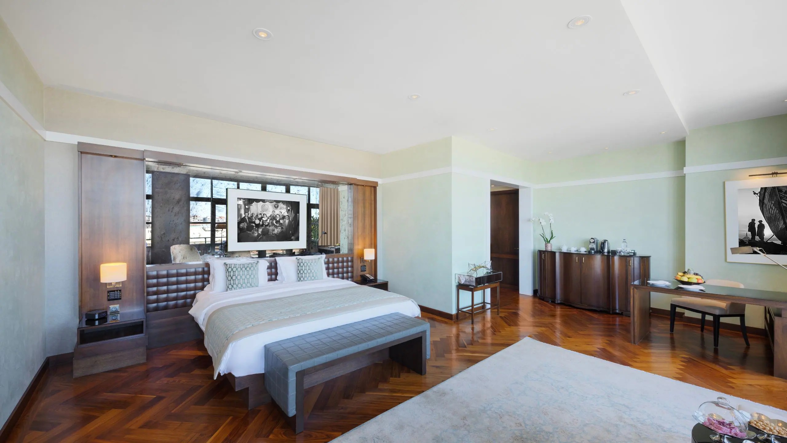 8층에 위치한 70㎡ 면적의 이 스위트는 킹 베드, 업무용 데스크, 미니바, 별도의 좌석 공간을 갖추고 있습니다. 터키식 욕실에는 화장품 냉장 보관함, 깊은 욕조, Dornbracht 레인폴 샤워기가 마련되어 있습니다.