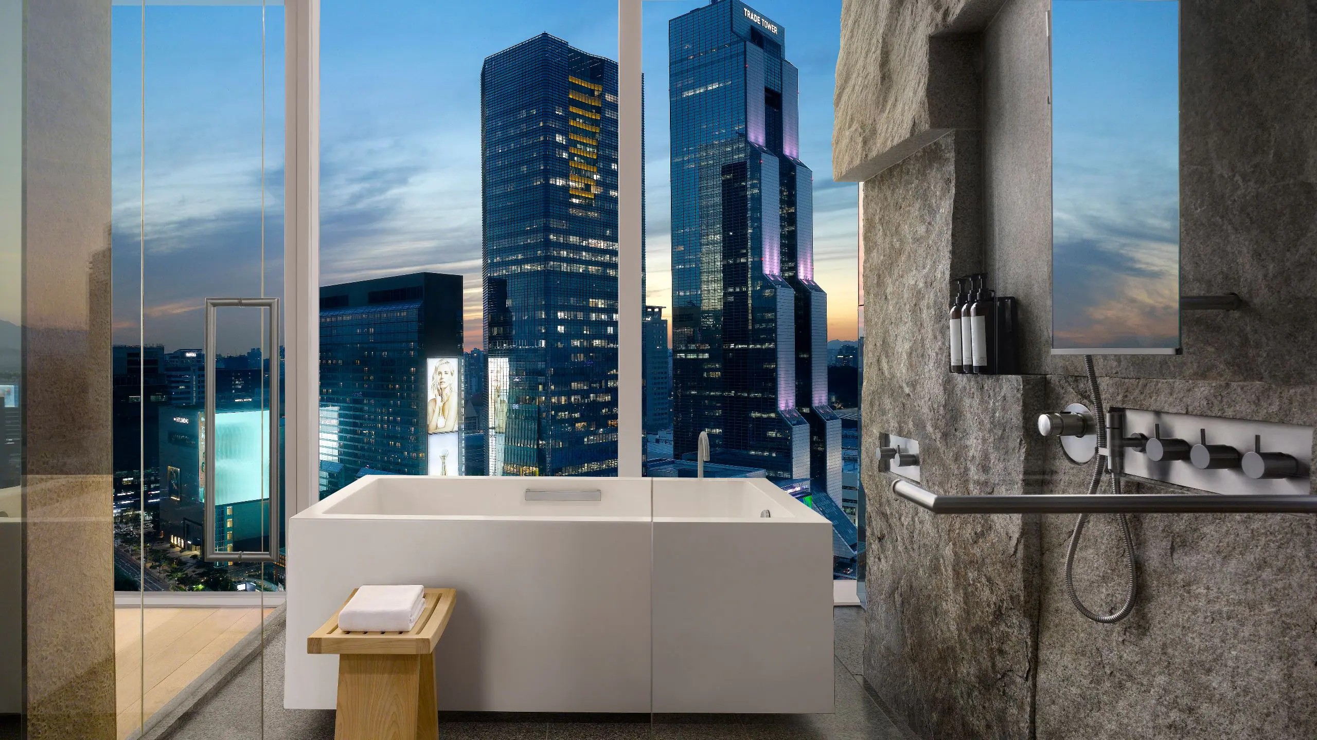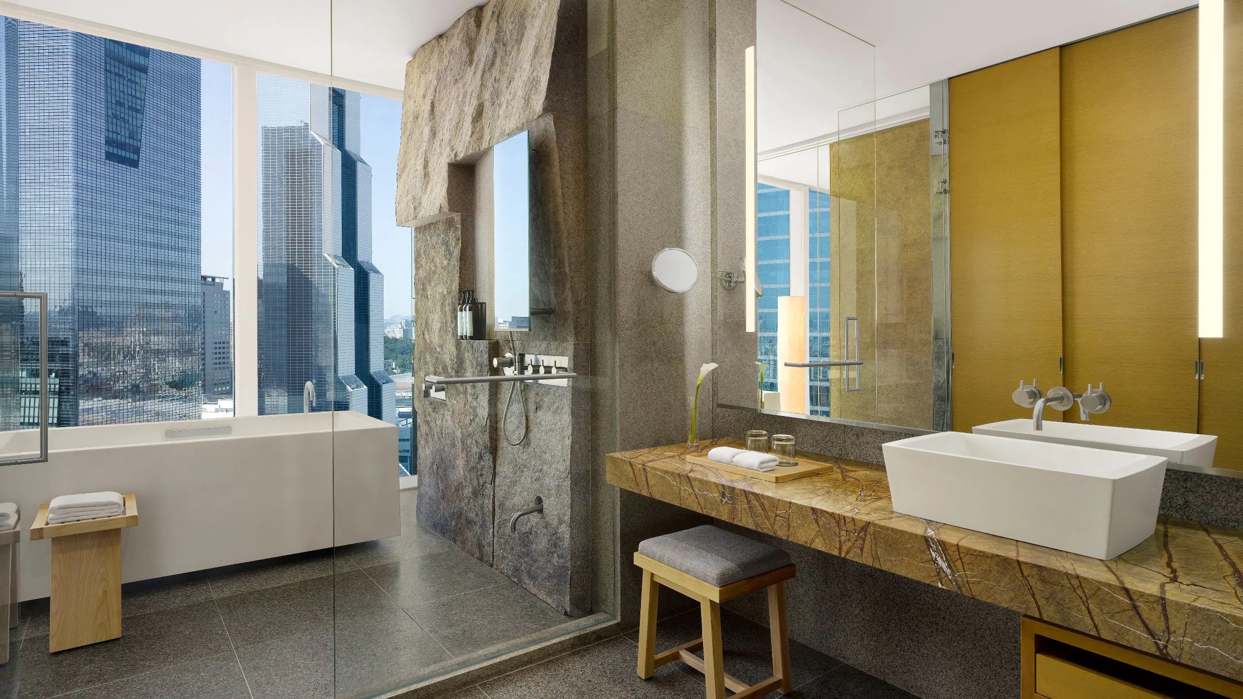 도심 위 15층~22층에 위치한 52㎡ 규모의 이 객실은 강남의 탁 트인 전망을 자랑하며, 휴식을 위해 디자인된 스파 스타일의 화강암 욕실을 갖추고 있습니다.