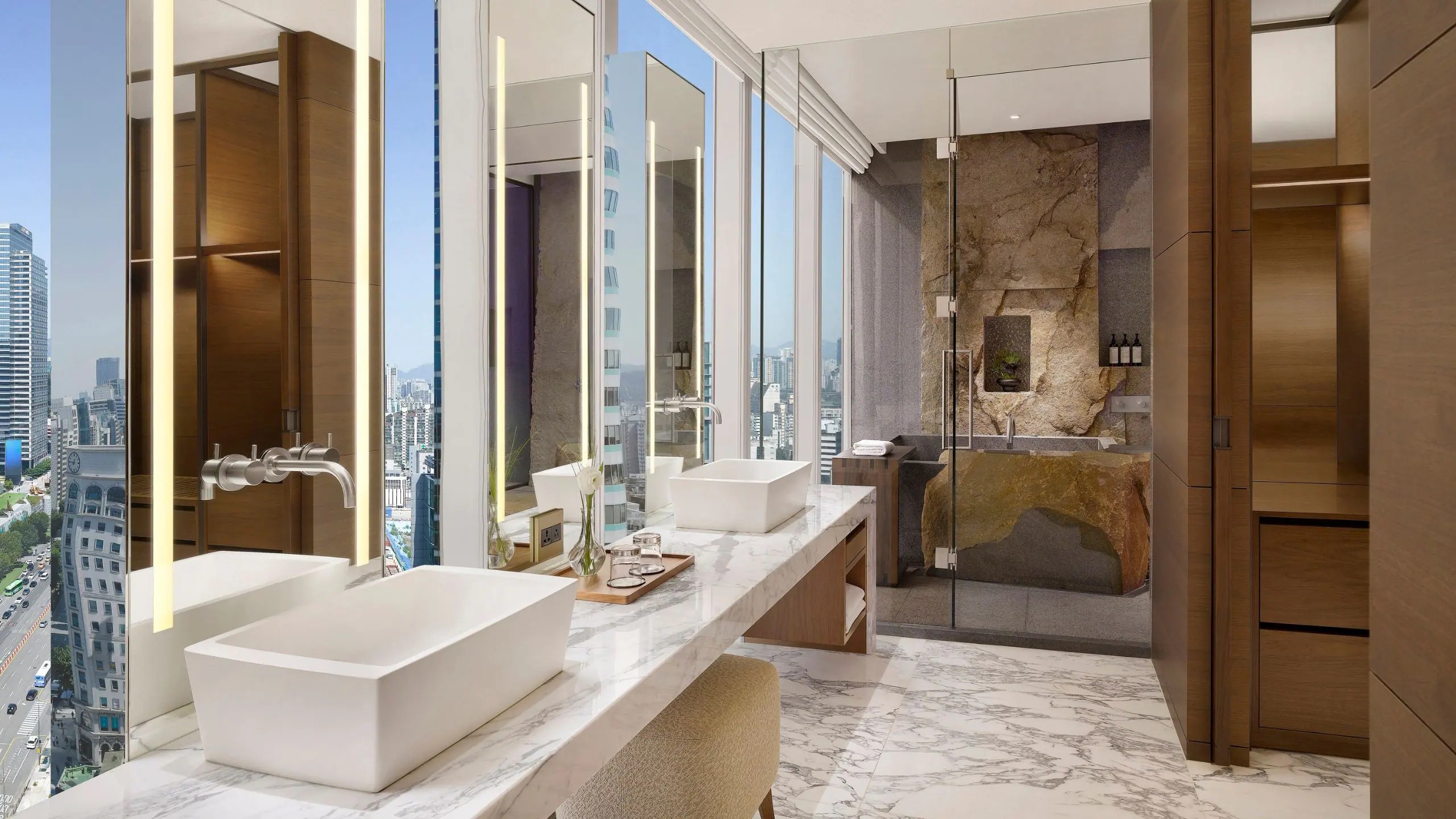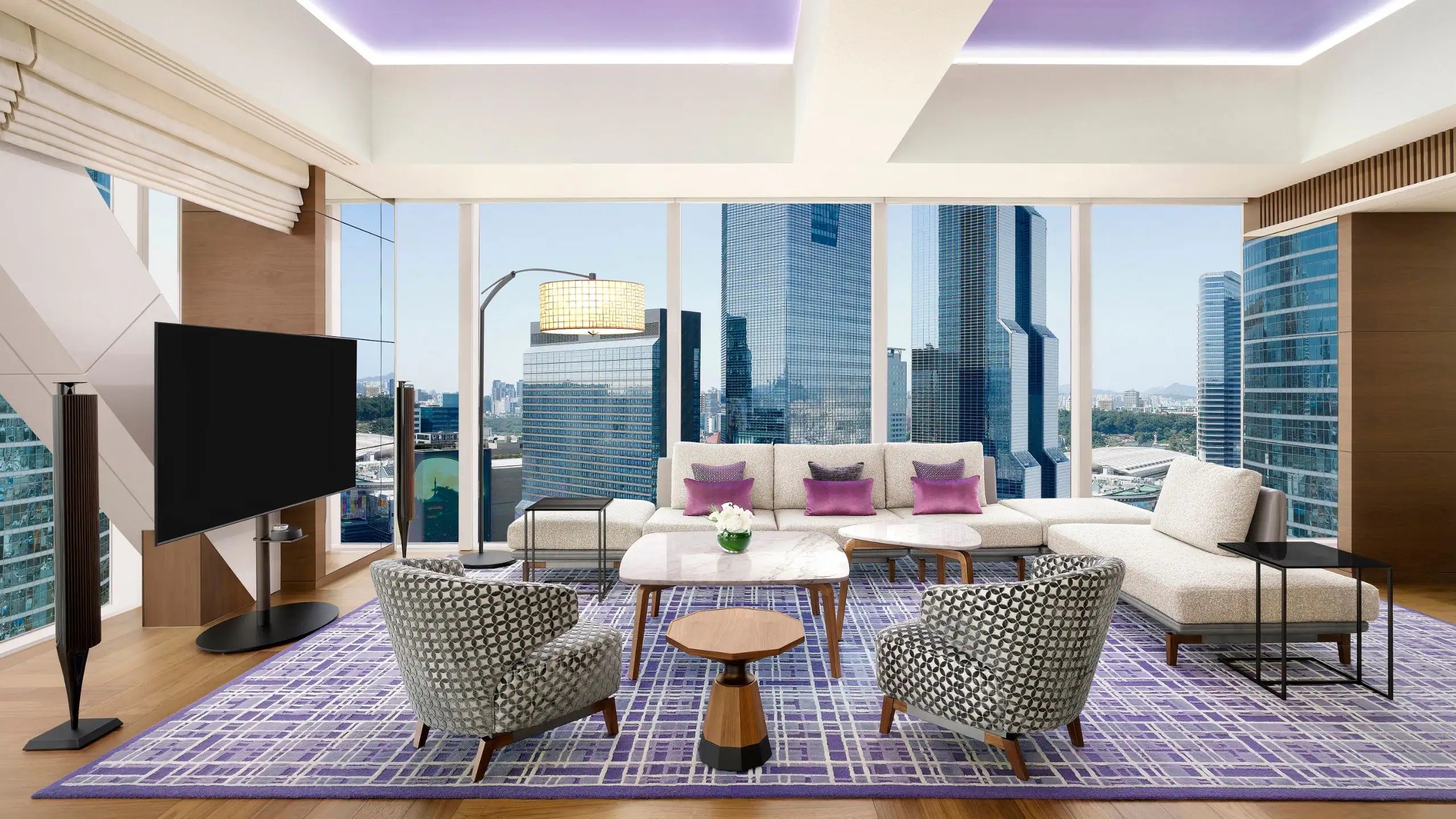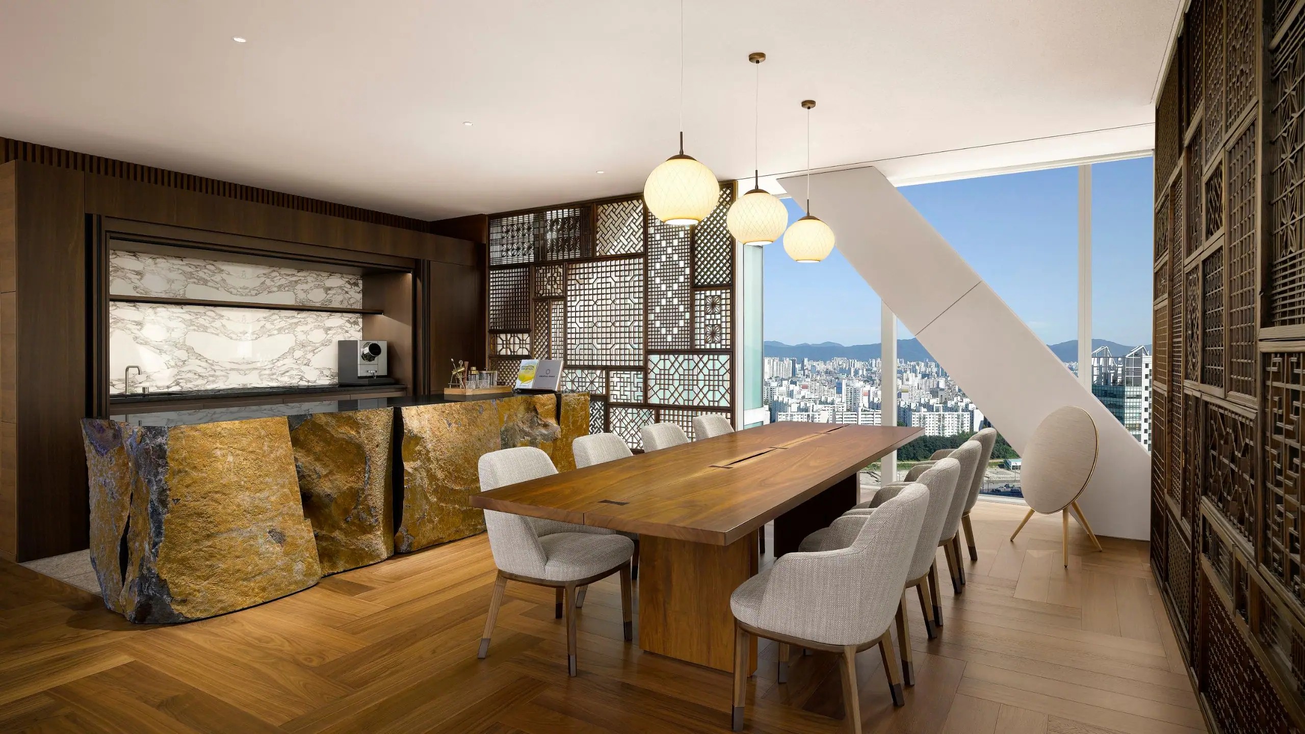 최상층에 위치한 160㎡ 규모의 스위트로, 탁 트인 시티 뷰와 한국적인 미학이 가미된 품격 있는 럭셔리를 선사합니다. 프리미엄 스위트입니다. 업그레이드 가능 여부는 World of Hyatt 프로그램 약관을 참조하십시오.