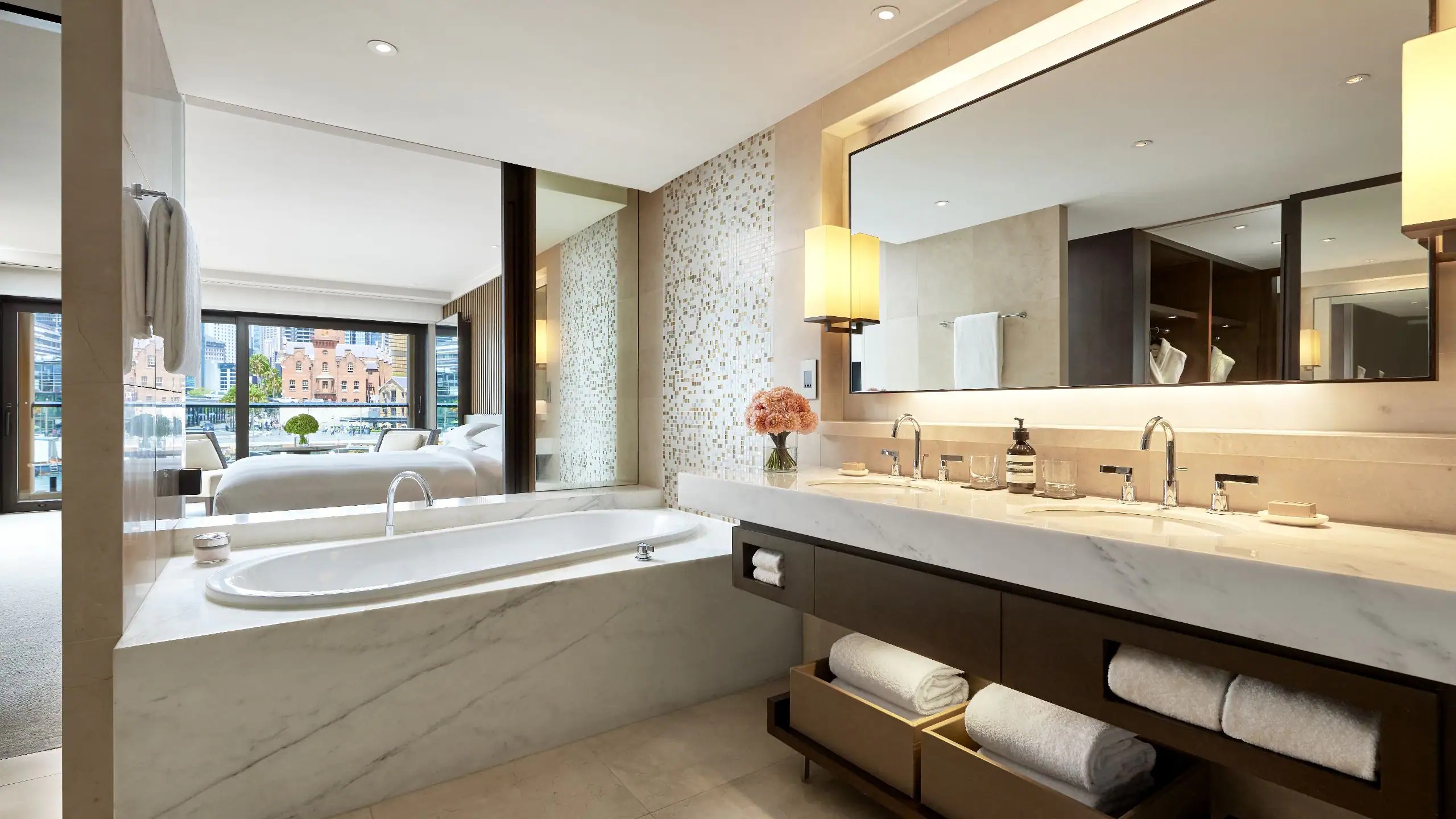 120㎡(1291sqft) 면적의 고급스러운 원 베드룸 스위트로, 마스터 베드룸, 넓은 라운지, 다이닝 공간 및 게스트 파우더룸을 갖추고 있습니다. 3개의 전용 발코니에서는 시드니 하버, 서큘러 키, 도시 스카이라인의 전망을 바로 감상할 수 있습니다. 라운지룸과 3개의 발코니 중 한 곳에서 시드니 오페라 하우스를 조망할 수 있습니다. 이 객실은 스페셜티 스위트입니다.
