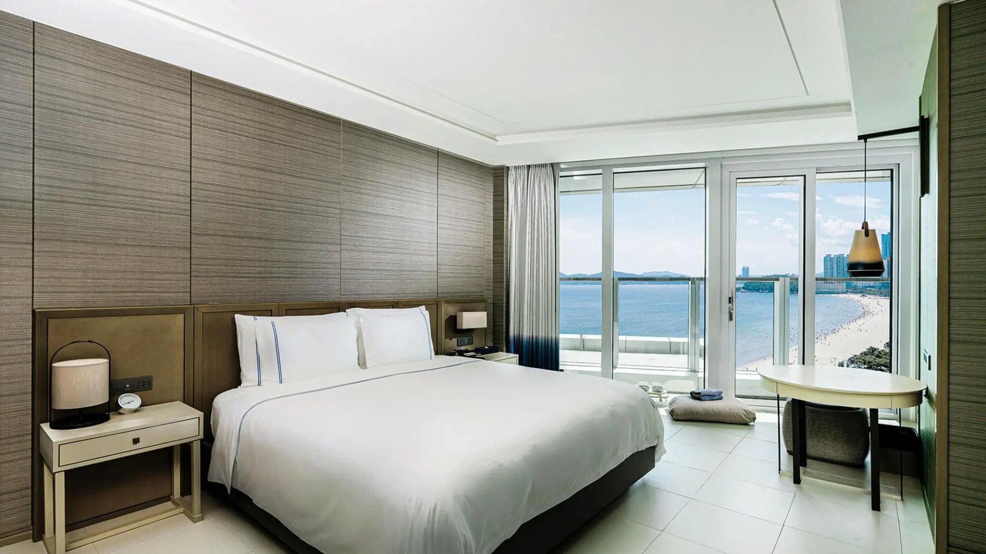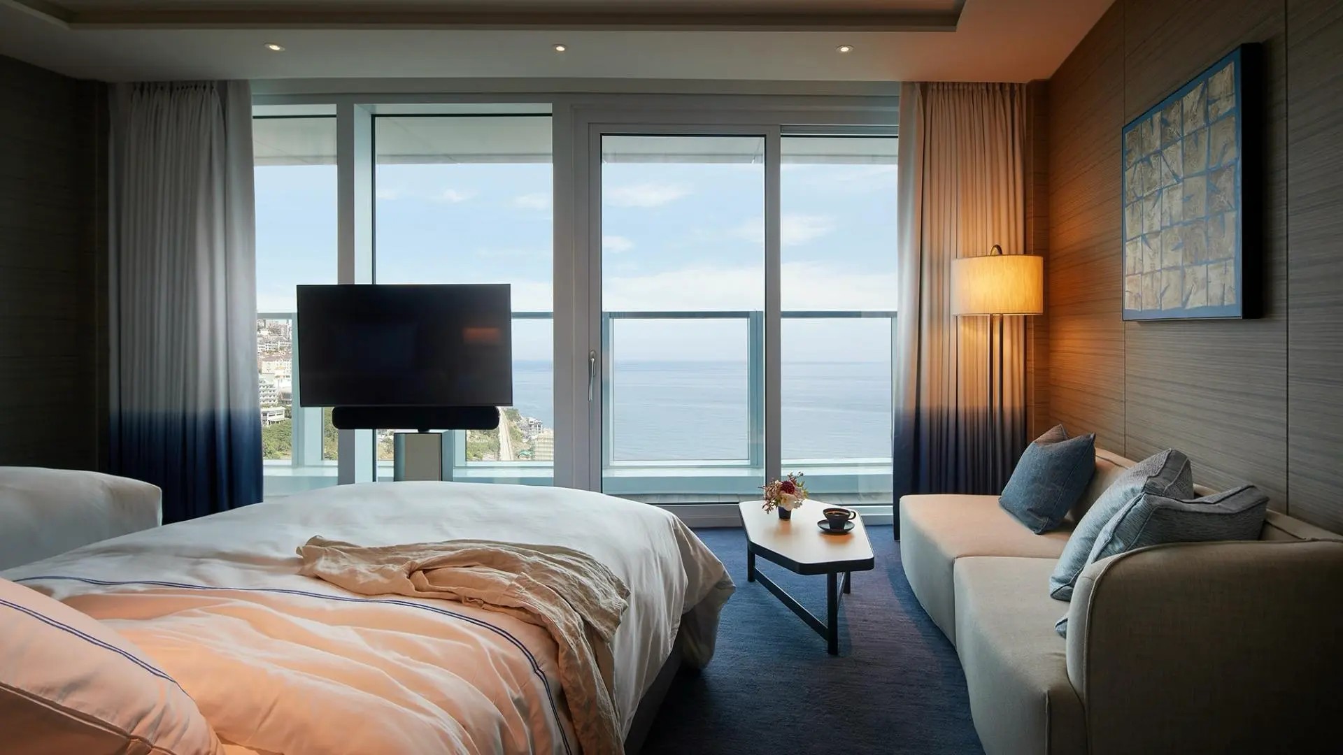 침실, 발코니 2개, 소파를 갖춘 넓은 객실입니다. 해운대 바다 전망과 도시의 야경을 함께 즐길 수 있는 비즈니스 및 레저를 위한 럭셔리한 객실입니다. ※ 상기 객실 이미지는 실제와 다를 수 있습니다.
