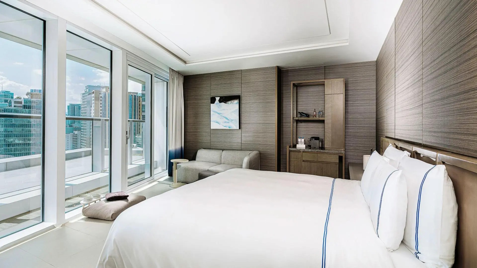 세련되고 우아함을 더하는 고급스러운 인테리어의 객실입니다. 넓은 발코니 창을 통해 야외 스파 풀과 아름다운 해운대 바다 전망을 감상하실 수 있습니다. ※ 상기 객실 이미지는 실제와 다를 수 있습니다.