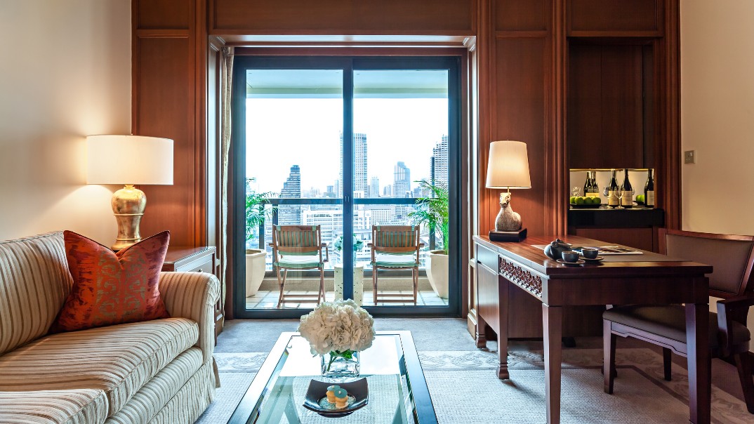 차오프라야 강과 방콕 스카이라인 전망의 가구가 비치된 외부 발코니