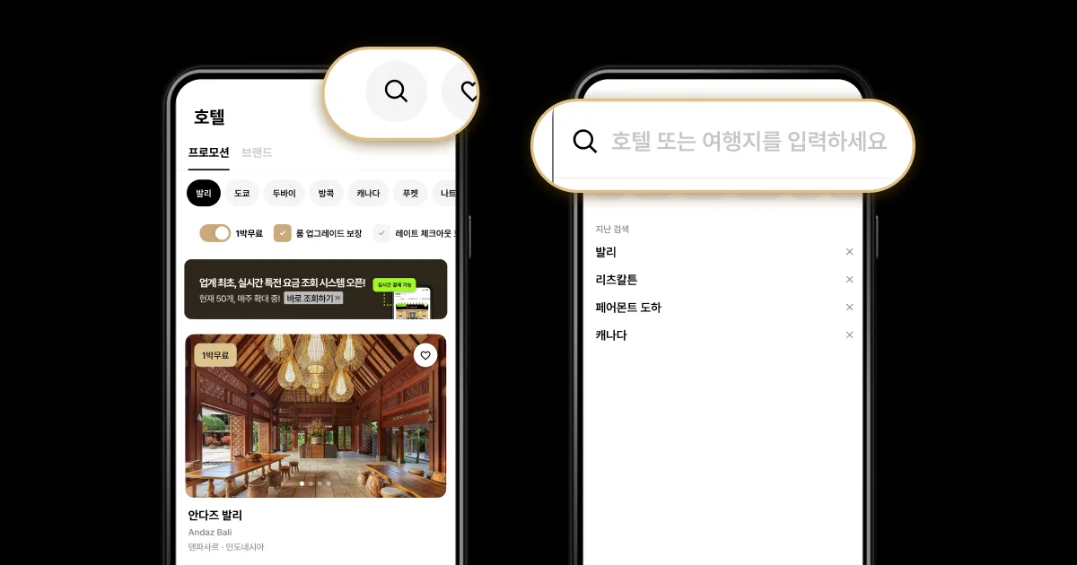 목적지가 명확할 때: 우측 상단의 돋보기 아이콘을 통해 원하는 호텔이나 도시를 직접 검색하여 가장 빠르게 프리미엄 스테이를 찾아보세요.