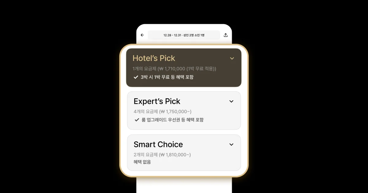 요금별 세부 옵션: [2인 조식 제공], [얼리 체크인 우선권] 등 각 요금 옵션에 포함된 세부 특전을 확인하고 나에게 가장 합리적인 구성을 선택해보세요.