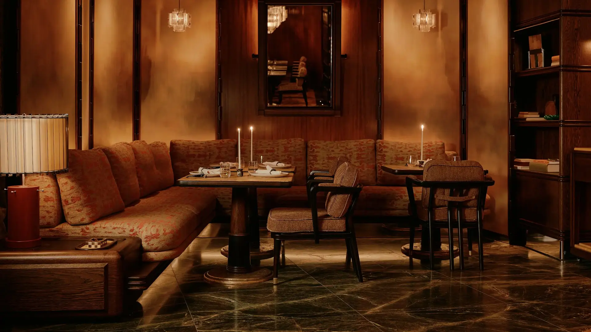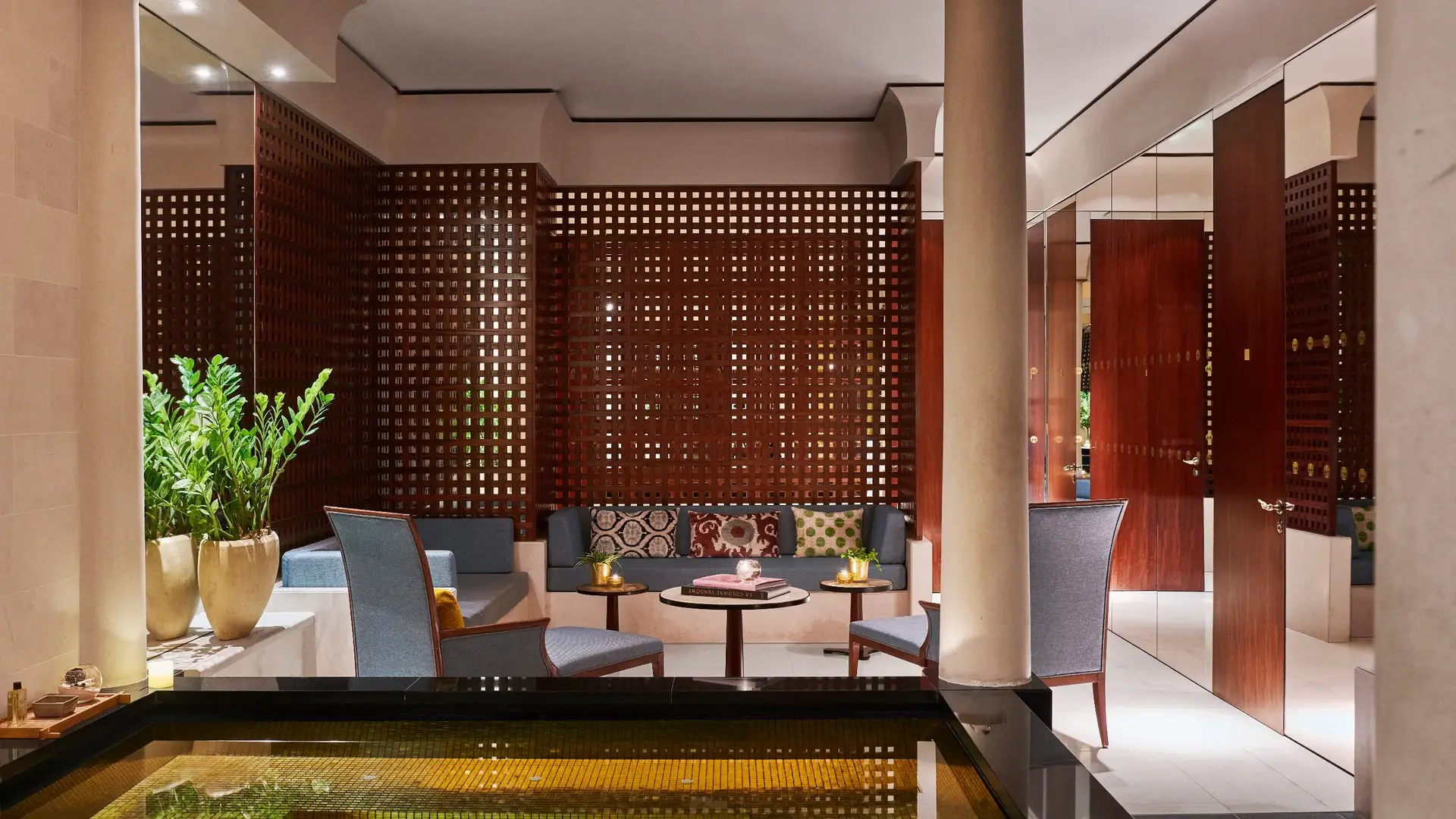 그는 화려한 장식 대신 '소재의 진정성'에 집중했습니다. 라임스톤(석회암)의 부드러운 베이지 톤, 마호가니 목재의 중후함, 그리고 곳곳에 배치된 청동 조각이 공간을 묵직하게 채우고 있죠.