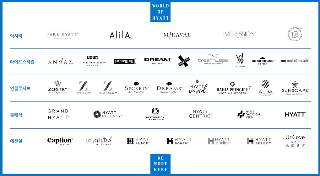 주요 브랜드: 하얏트 플레이스, 하얏트 하우스, 캡션, 하얏트 스튜디오, 하얏트 셀렉트, 언스크립티드 등