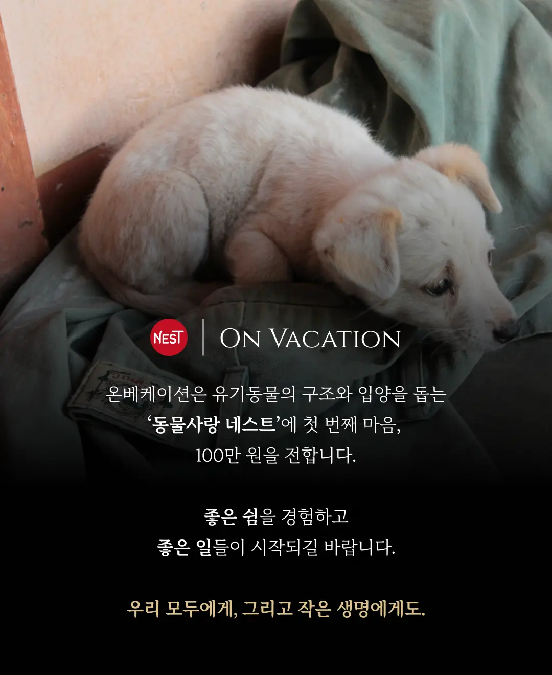 이번 겨울, 우리는 유기동물의 구조와 입양을 돕는 ‘동물사랑 네스트’에 100만원을 후원했습니다. 이 금액은 한 마리의 유기견을 구조하고, 건강검진을 받게 하고, 그리고 새 보금자리를 얻기까지 기본적인 의식주를 제공하는 데 드는 비용입니다.
