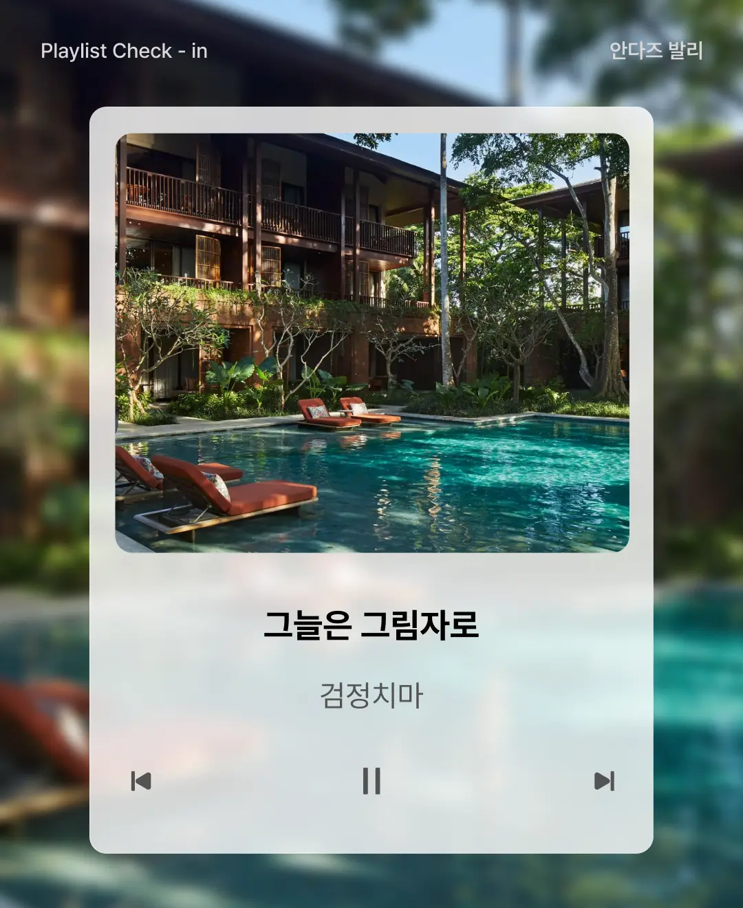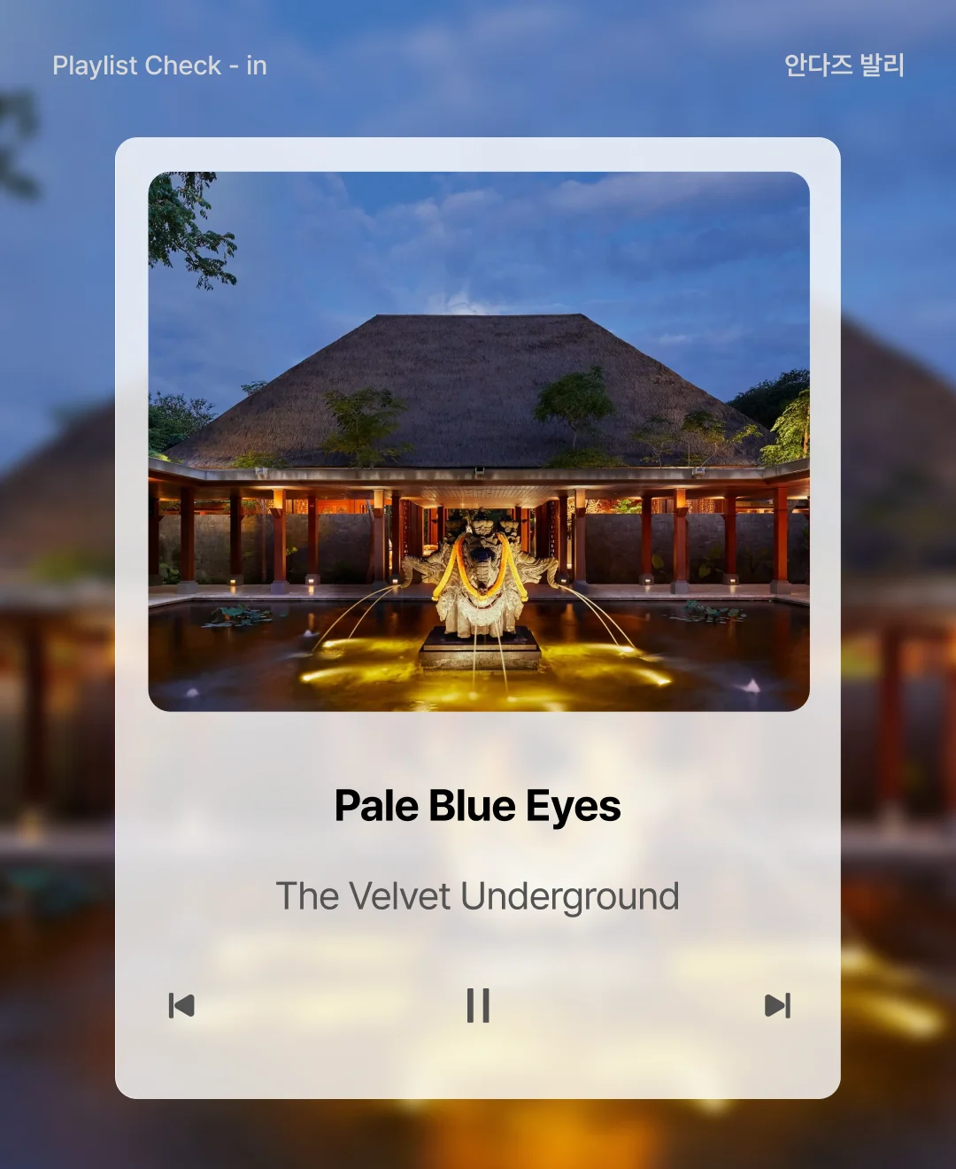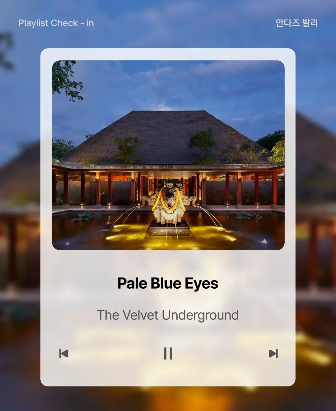 담백한 기타 사운드와 반복되는 가사는 시간이 멈춘 듯한 휴식의 순간을 만들어냅니다. 시대를 초월한 이 곡은 안다즈 발리의 미니멀한 공간에서 오히려 더 선명하게 들립니다. 밤의 고요를 온전히 즐기고 싶을 때 추천합니다.